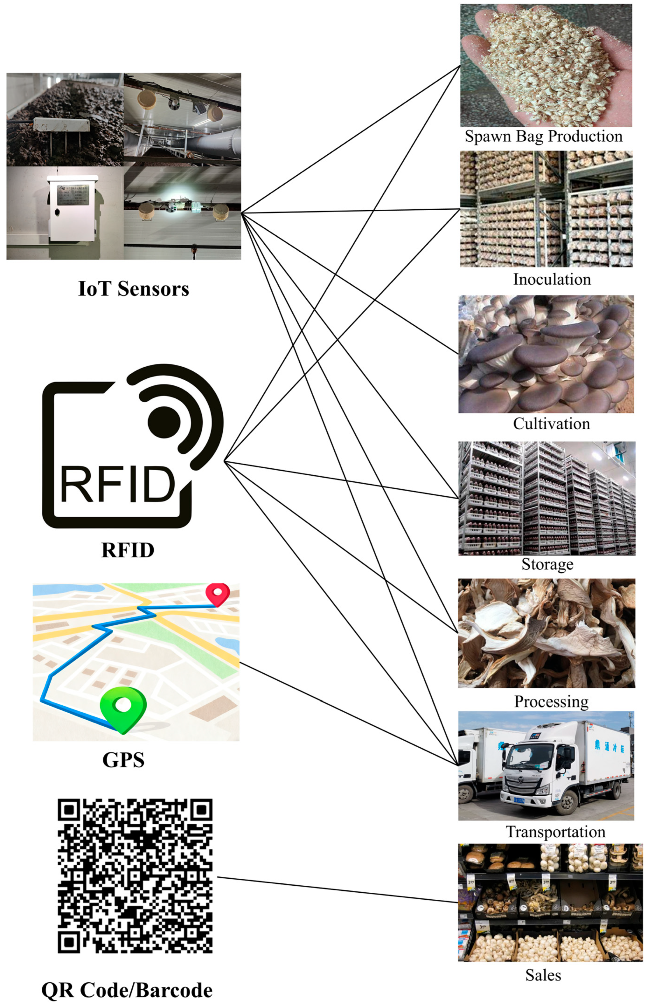 To overcome these limitations, it is essential to build a trustworthy traceability framework capable of simultaneously ensuring environmental quality monitoring, spoilage risk control, and food safety assurance. Therefore, this study proposes a flexible traceability system for the P. ostreatus supply chain that combines real-time IoT sensing with blockchain-based trustworthy storage. Across cultivation, storage, and cold-chain transportation stages, the system records and traces key food safety indicators—including temperature, humidity, CO2 concentration, batch inspection results, and recall responses—in a secure and verifiable manner. The primary goals are to reduce spoilage risk, improve the accuracy and efficiency of incident localization and recall, and provide regulatory agencies with auditable evidence. This framework addresses existing research gaps and offers a novel digital solution for food preservation, safety assurance, and quality control.
