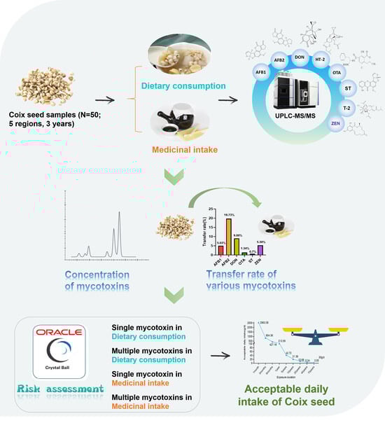 Han, Y.; Wang, L.; Yuan, Q.; Guo, L.; Kang, C.; Yang, Y.; Xiao, C.; Yang, C.; Zhang, J.; Zhou, T. Mycotoxins Co-Exposure Risk Assessment in Coix Seed: Contamination Levels and Safety for Dietary Consumption and Medicinal Intake. Foods 2025, 14, 3965. https://doi.org/10.3390/foods14223965