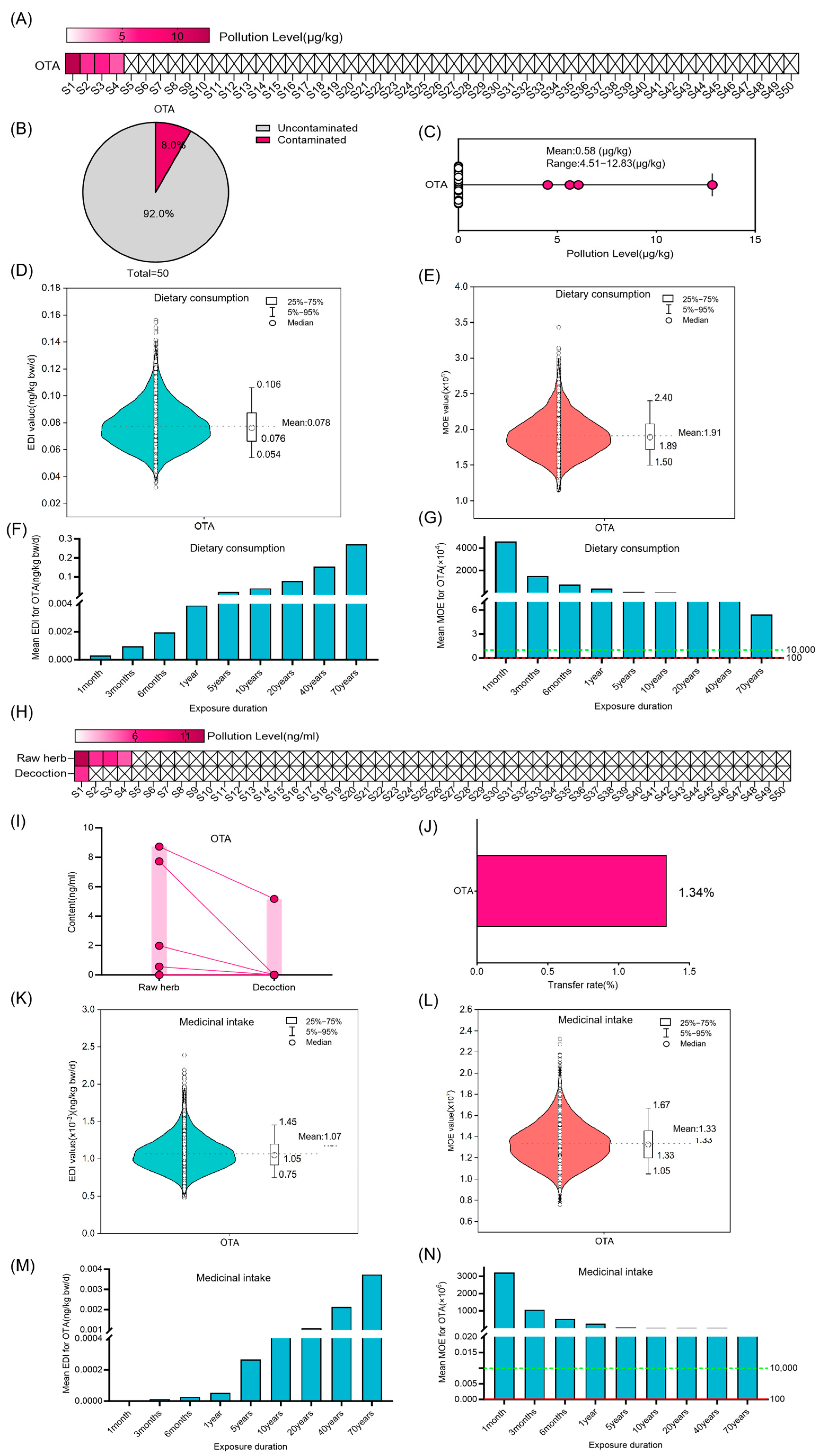 - Zhu, Y.; Wang, S.; Xu, X.; Wang, L.; Zhou, H.; Ying, X.; Hu, Q.; Wang, X.; Ji, S.; Cai, Q. Exposure assessment and risk-based limit levels evaluation of ochratoxin A in Astragali Radix in China. Ecotoxicol. Environ. Saf. 2022, 237, 113517. [Google Scholar] [CrossRef]