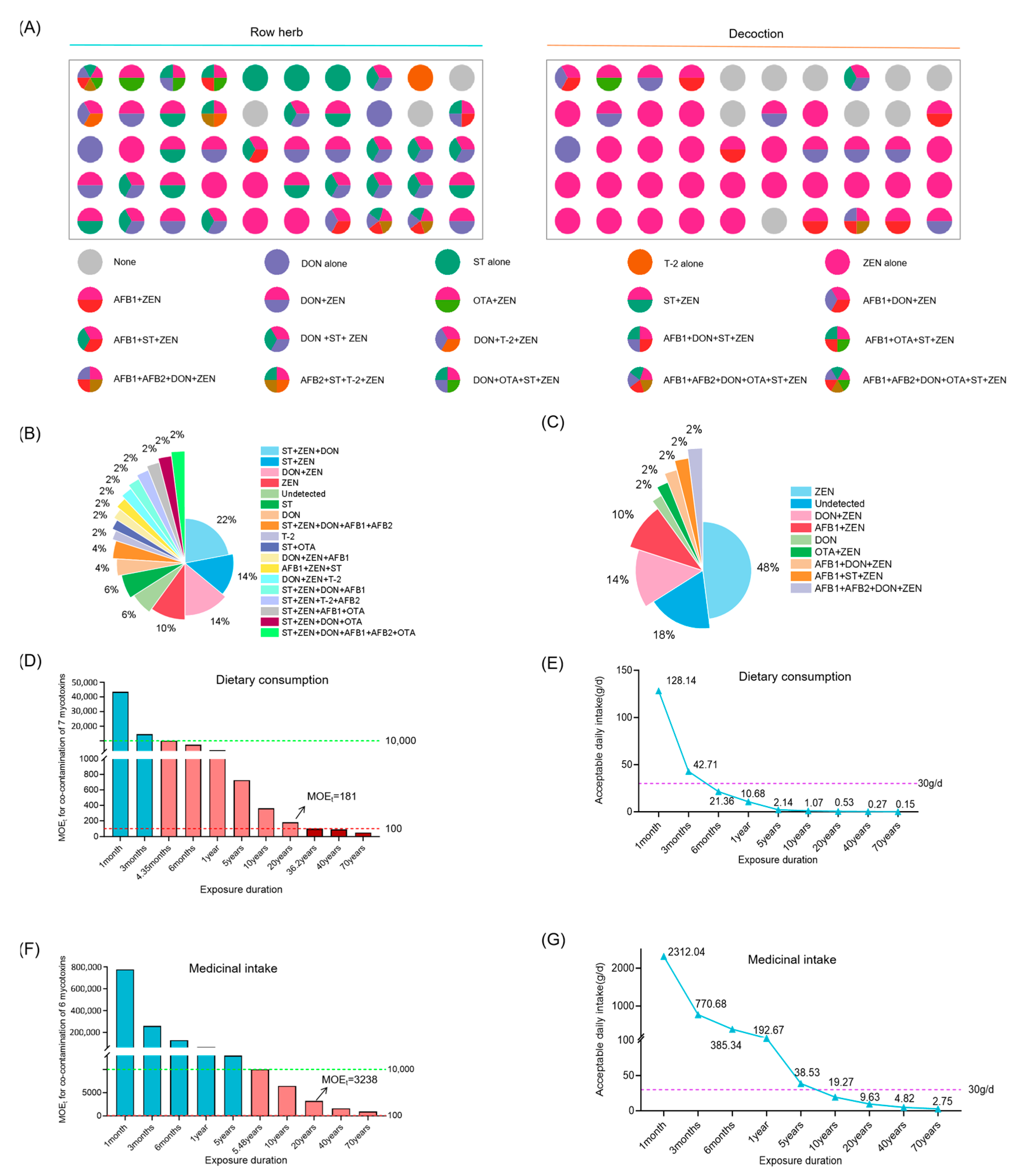 - Liao, X.; Li, Y.; Long, N.; Xu, Q.; Li, P.; Wang, J.; Zhou, L.; Kong, W. Multi-mycotoxin detection and human exposure risk assessment in medicinal foods. Food Res. Int. 2023, 164, 112456. [Google Scholar] [CrossRef]