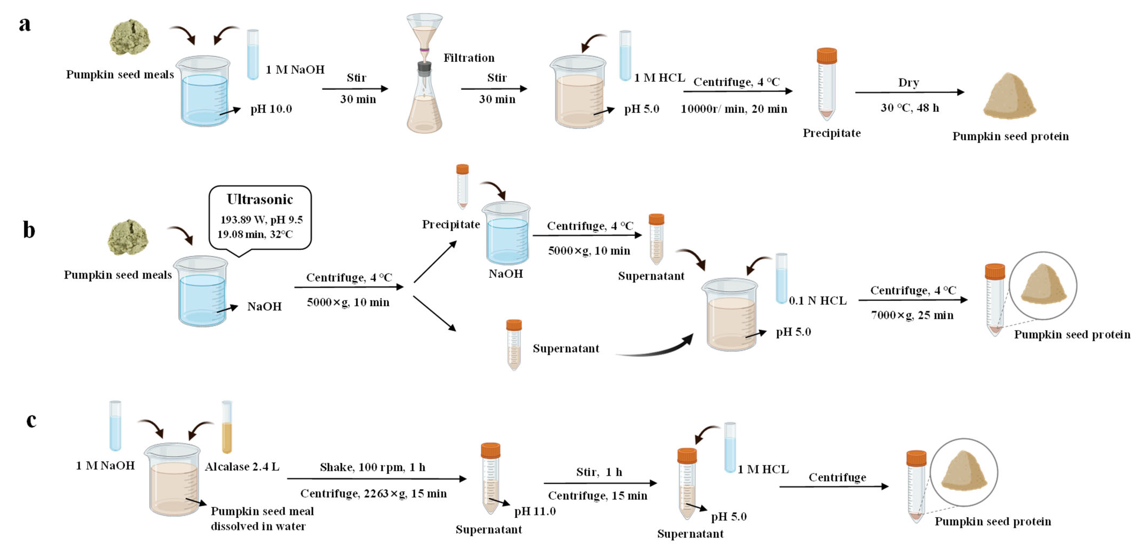 - Sert, D.; Rohm, H.; Struck, S. Ultrasound-assisted extraction of protein from pumpkin seed press cake: Impact on protein yield and techno-functionality. Foods 2022, 11, 4029. [Google Scholar] [CrossRef]