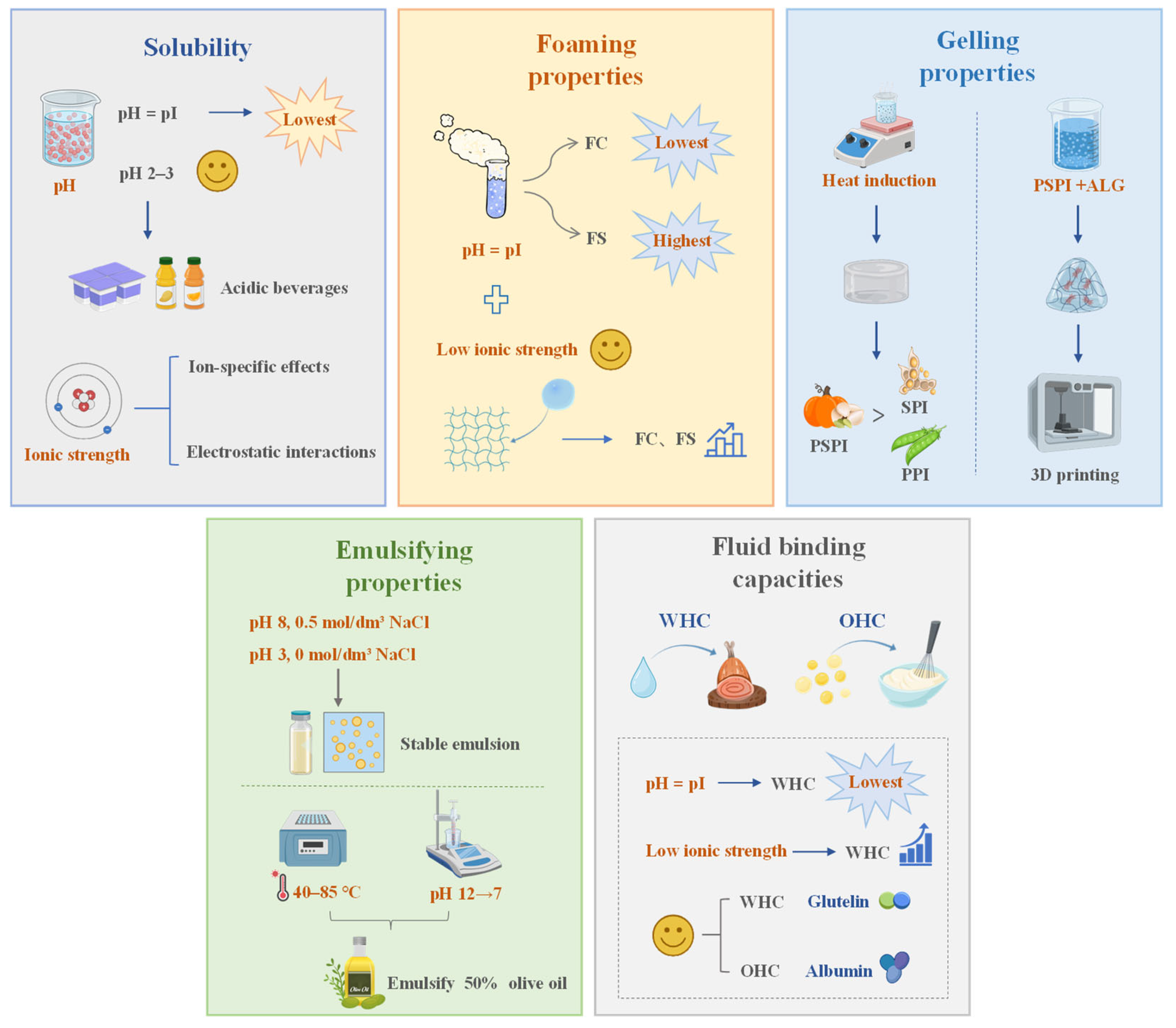 | High-pressure homogenization (100 MPa) | Disruption of protein tertiary and quaternary structures by hydrogen bond cleavage | Solubility increased to 30.21 ± 0.93%; effectively improved the emulsification index of PSPI; FC increased to 24.58 ± 5.57%, but FS showed a decreasing trend | [69] | |