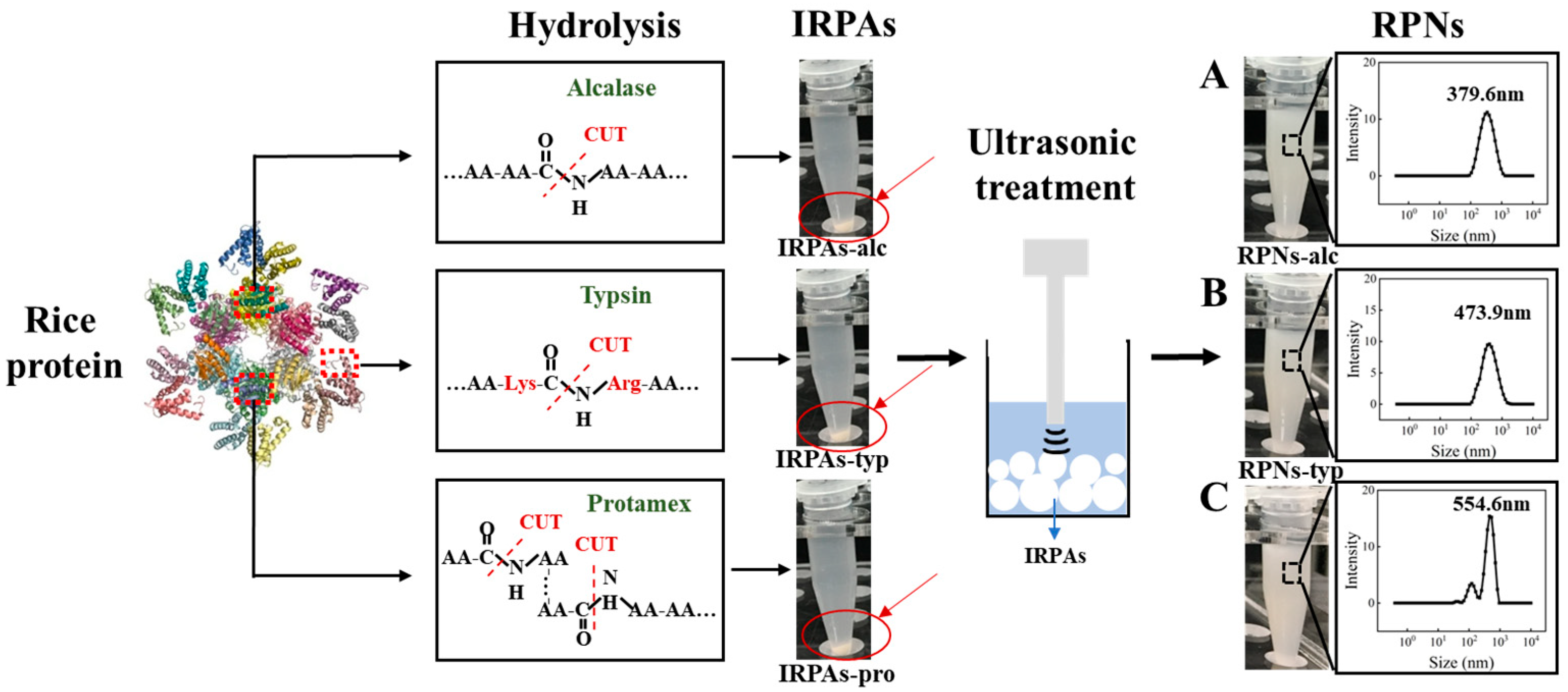 - Shen, P.; Zhou, F.; Zhang, Y.; Yuan, D.; Zhao, Q.; Zhao, M. Formation and characterization of soy protein nanoparticles by controlled partial enzymatic hydrolysis. Food Hydrocoll. 2020, 105, 105844. [Google Scholar] [CrossRef]