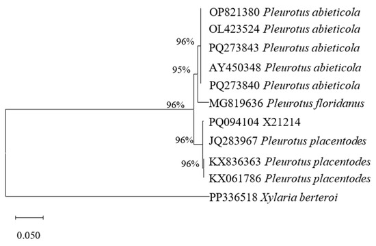 Molecular identification: The pure DNA template was extracted using OMEGA fungal DNA extraction kit. Subsequently, the DNA was used as a template, and the universal fungal primers ITS1/ITS4 primer pair [7], which is widely used in the identification of mushroom in the ITS region, was used for PCR amplification according to the method described by Jin et al. [10]. The PCR program consisted of an initial denaturation at 95 °C for 5 min, followed by 35 cycles of 95 °C for 30 s, 58 °C for 30 s, and 72 °C for 90 s, and a final extension at 72 °C for 7 min. After PCR amplification, 3 μL PCR products were analyzed by 1% agarose gel electrophoresis to verify the quality and specificity of the amplified products. If the electrophoresis results show a single and bright band, it indicates that the amplification is successful, and then the remaining PCR products are entrusted to Fuzhou Baijing Biotechnology Co., Ltd. (Fuzhou, China) for sequencing services. The obtained sequences were accurately submitted to the NCBI nucleotide database (URL: http://www.ncbi.nlm.nih.gov/, accessed on 17 May 2025). Subsequently, the obtained ITS sequence was submitted to GenBank and assigned the accession number PQ094104 (Submission date: 31 July 2024). Using MEGA 12.0 software, the ITS sequences with high similarity were aligned with reference sequences from related Pleurotus species using the MUSCLE algorithm (default parameters). Poorly aligned or ambiguous regions were manually trimmed to ensure positional homology. Phylogenetic analysis was performed using the maximum likelihood (ML) method under the Kimura 2-parameter (K2P) substitution model. The ITS sequence of Xylaria berteroi was used as the outgroup for tree rooting and comparative analysis.