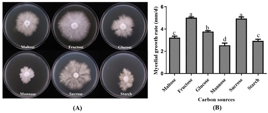 Statistical analysis of the growth of the strain P. placentodes X21214 on different carbon sources revealed significant differences (Figure 3). The results showed that the optimum carbon sources for mycelial growth were fructose (5.01 ± 0.16 mm/d) and sucrose (4.94 ± 0.24 mm/d), followed by glucose (3.77 ± 0.13 mm/d) and maltose (3.22 ± 0.344 mm/d). In contrast, the strain exhibited poor growth on starch (2.93 ± 0.37 mm/d) and mannose (2.54 ± 0.47 mm/d), characterized by slow and weak mycelial development with irregular margins.