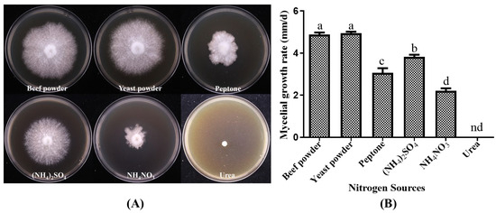 Effects of different nitrogen sources on mycelial growth of P. placentodes X21214. (A) Mycelial growth in various media. (B) Growth rate of mycelium under different media. Lowercase letters on the column chart indicate significant differences between different letters marked with the same index (p < 0.05), among them, "nd" indicates no growth.
