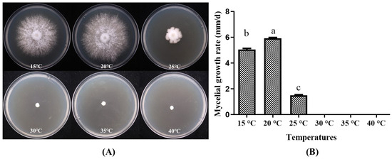 The strain P. placentodes X21214 growth on different temperature ranges found statistically significant (Figure 6) that the optimum temperature for mycelial growth recorded at 20 °C (5.92 ± 0.17 mm/d), followed by 15 °C (5.05 ± 0.19 mm/d). When the temperature is ≥30 °C, the mycelium does not germinate.