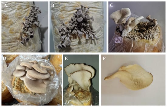 The wet weight of each bag of substrate is 900 g, and there is approximately 342 g of dry matter. The first flush of fruiting bodies yielded an average fresh weight of 39.40 g per mushroom per bag, with a biological efficiency of 11.5%. The growth characteristics of the cultivated P. placentodes are shown in Figure 7. The mycelium was white, and the primordia initially appeared dark gray (Figure 7A,B). The pileus was discoid, flattened or slightly depressed, and tapered from the base to the margin. As the fruiting bodies developed, their color gradually shifted to creamy white (Figure 7C,D). During maturation, the central or subcentral area of the pileus became depressed, forming a cup-shaped or fan-like appearance. The center was light yellowish-brown, while the margin was grayish-brown with a wavy, curled edge. The stipe was lateral, covered with tomentum, and ivory-white in color, exhibiting slight toughness. The context was white and relatively thin, and the lamellae were straight and radiated outwards (Figure 7E,F).