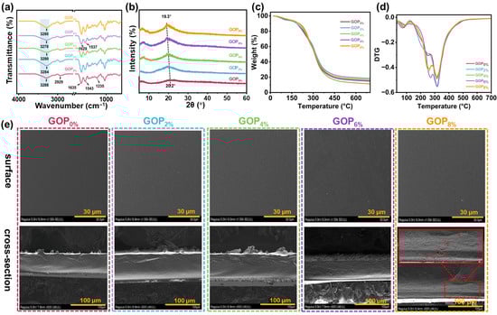(a) FTIR spectra, (b) XRD patterns, (c) TGA curves, and (d) DTG curves of the composite films. (e) SEM images of composite films.