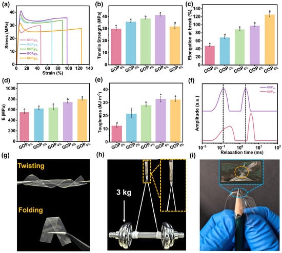 (a) Stress–strain curves, (b) tensile strength, (c) elongation at break, (d) Young’s modulus, and (e) toughness of composite films. (f) LF-NMR spectra of GOP0% and GOP6%. (g) Twisting and folding images of the GOP6% film. (h) Optical image showing GOP6% film supporting 3 kg. (i) Puncture resistance of the GOP6% film. Different letters on the bar indicate significant differences (p < 0.05).