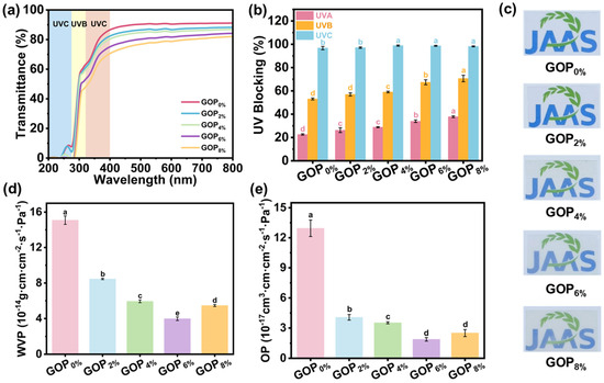 (a) UV-Vis spectra, (b) UVA, UVB and UVC blocking rates, (c) optical photographs, (d) water vapor permeability, and (e) oxygen permeability of the composite films. Different letters on the bar indicate significant differences (p < 0.05).