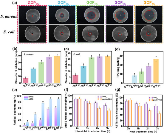 (a) Inhibition zones of GOPX% against S. aureus and E. coli (red dashed circles representing the inhibition zones). Diameter of inhibition zones against (b) S. aureus and (c) E. coli. (d) Total phenol content and (e) radical scavenging of GOPX%. ABTS radical scavenging of GOP6% and gelatin/OEO following UV (f) and heat (g) treatments. Different letters indicate significant differences (p < 0.05).