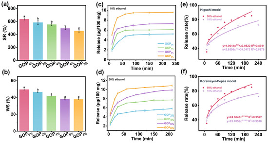 As shown in Figure 6a, the swelling rate (SR) decreased significantly upon AOPE addition, which may be attributed to the enhanced intermolecular interactions and increased hydrophobicity imparted by AOPE. These effects reduce the availability of hydrophilic groups within the film matrix and consequently limit water uptake. The GOP0% exhibited the highest WS (49.5 ± 0.7%), reflecting gelatin’s inherent hydrophilicity (Figure 6b). The WS values of the GOP2%, GOP4%, GOP6%, and GOP8% films gradually decreased to 46.6 ± 0.8%, 41.9 ± 0.3%, 38.3 ± 0.4%, and 37.9 ± 0.7%, respectively. This reduction may be due to AOPE promoting the formation of a denser and less permeable film matrix [70]. Overall, these results indicate that AOPE effectively enhances the water resistance of gelatin-based films.