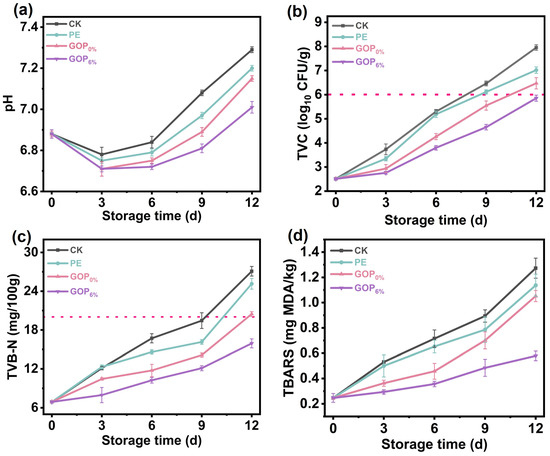 A 5 g portion of each sample was homogenized with 50 mL of distilled water for 5 min. The supernatant was then collected via centrifugation, and its pH was measured by a pH meter (FE28, METTLER TOLEDO, Greifensee, Switzerland). The TVB-N values of grass carp fillets were quantified by an automatic Kjeldahl nitrogen analyzer (Kjeltec 8400, Foss, Seattle, WA, USA), with results expressed as mg/100 g of sample.