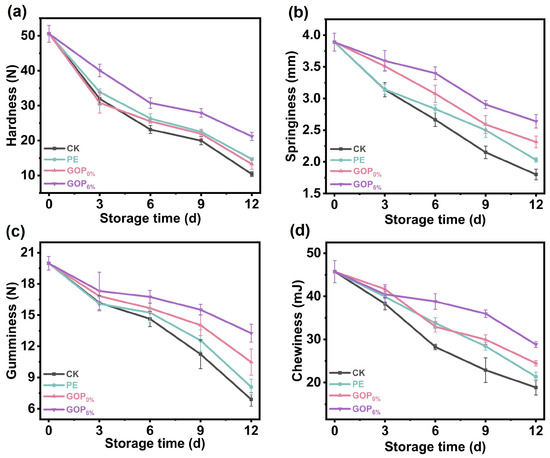 Fresh grass carp were purchased from a local market, where they were slaughtered on-site by the sellers using standard humane slaughter procedures to minimize stress. The samples were placed on ice and transported to the laboratory within 30 min for subsequent processing. Grass carp were cut into uniform samples (3 cm × 3 cm × 2 cm; ~20 g) rinsed with sterile water, and randomly assigned to four experimental groups: PE-wrapped (PE), GOP0%-wrapped (GOP0%), GOP6%-wrapped (GOP6%), and unwrapped controls (CK). All samples were stored at 4 °C and analyzed at 3-day intervals for preservation indicators.