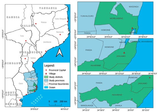 Mozambique, located in the southeastern region of Africa, has 10 geographic provinces, and mango is produced in all of them. This study focuses on the Inhambane province (Figure 2, left panel), an area known for high mango production. Within Inhambane, three districts—Morrumbene, Jangamo, and Inharrime—were selected for fieldwork because of their relevance to both mango production and nutrition programming (Figure 2, right panel).
