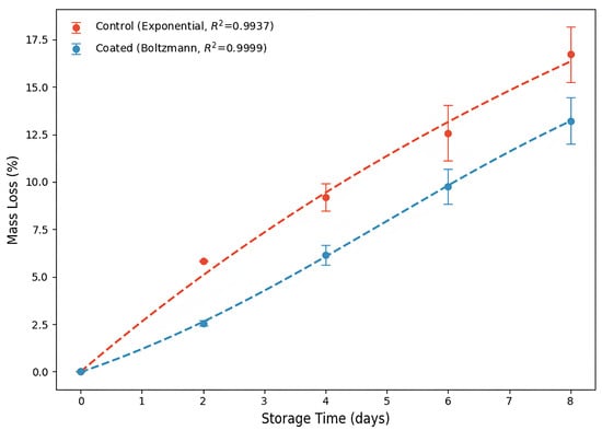 Mass loss (%) was determined by weighing the strawberries in a semi-analytical balance (Ohaus Adventurer ACR 120, Parsippany, NJ, USA) over storage days at 4 °C. The analysis was done on individual fruits placed inside the PET trays. Measurements were recorded at 0, 2, 4, 6, and 8 days. The mass difference was calculated by comparing the mass of the strawberry after coverage and before storage (0) with its relative mass at the subsequent storage days (n), according to Equation (7) []. That is, the mass of coated strawberries was compared to that of the fresh-coated strawberries. In contrast, the mass of the control strawberries was compared to that of the fresh-control strawberry during the subsequent days of storage, thus calculating the difference in mass for each day of similar fresh product. A statistical comparison of mass loss between the control and coated strawberry groups was conducted across all storage time to determine which group exhibited more pronounced mass loss relative to its respective control.