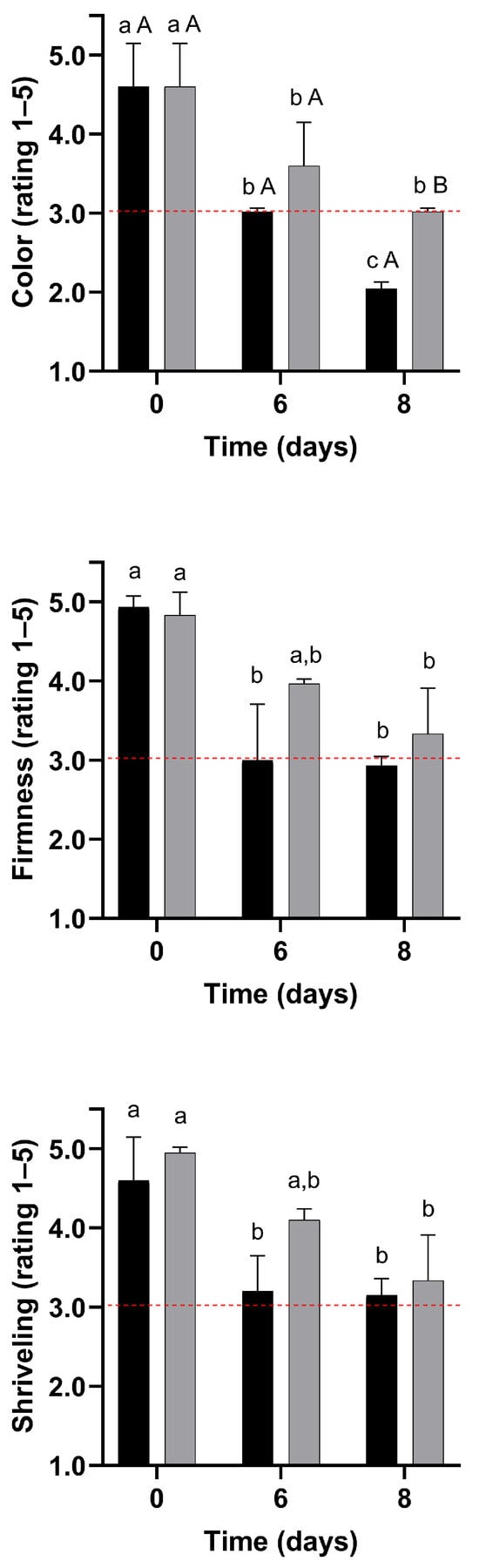 Subjective quality analysis was conducted independently at each predefined storage time point for both the control and coated groups. Subsequently, the subjective scores for each attribute at each storage point were statistically compared. For any attribute and day showing a significant difference, a higher score indicated superior quality in one group compared to the other.