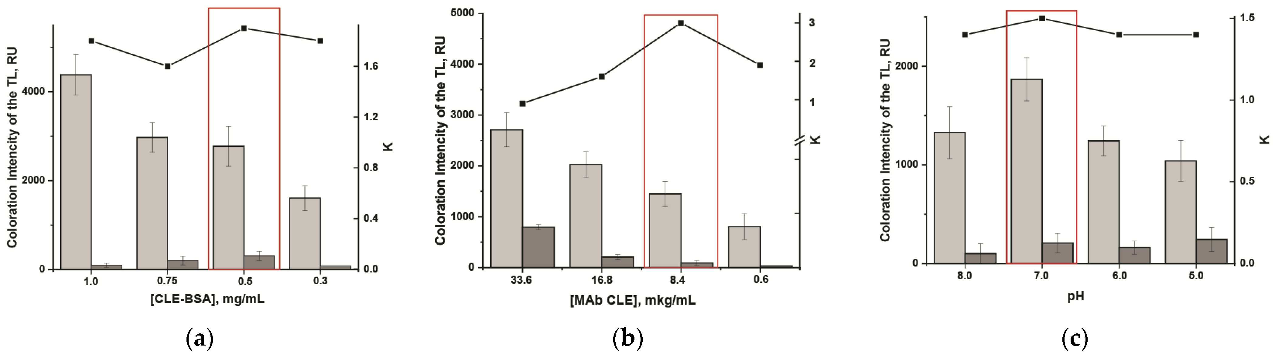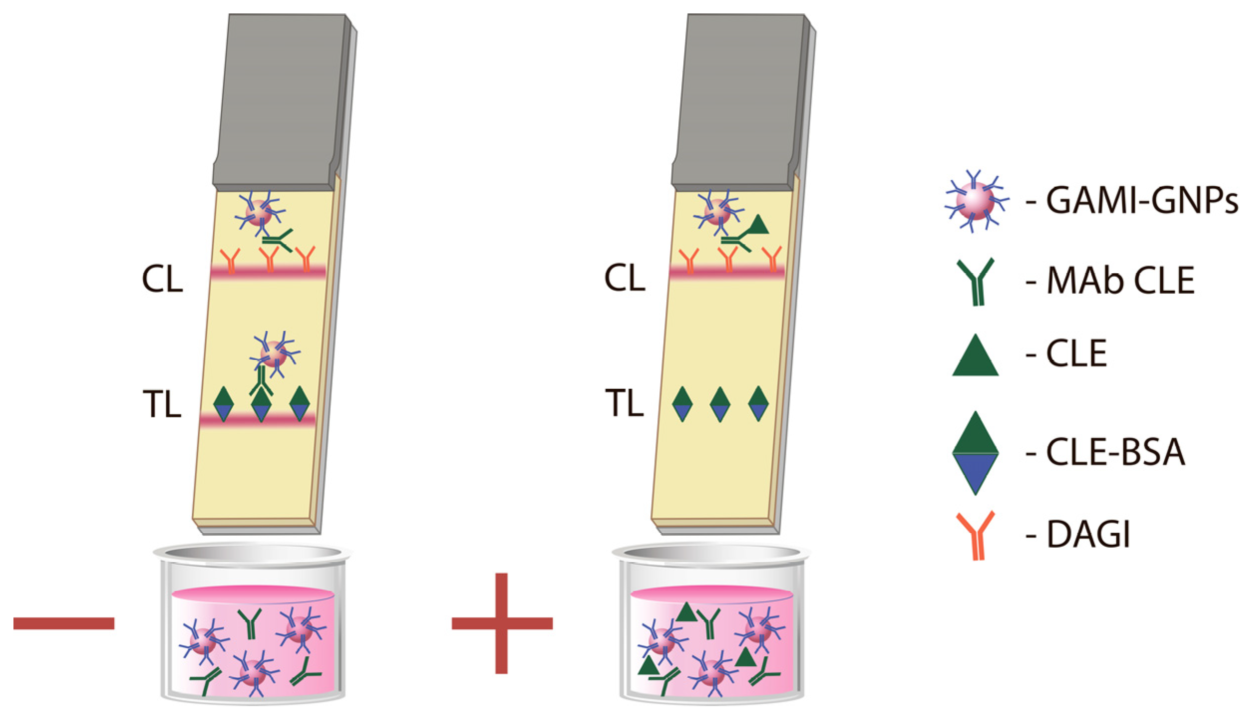 - Zhang, H.; Wang, L.; Yao, X.; Wang, Z.; Dou, L.; Su, L.; Zhao, M.; Sun, J.; Zhang, D.; Wang, J. Developing a simple immunochromatography assay for clenbuterol with sensitivity by one-step staining. J. Agric. Food Chem. 2020, 68, 15509–15515. [Google Scholar] [CrossRef]