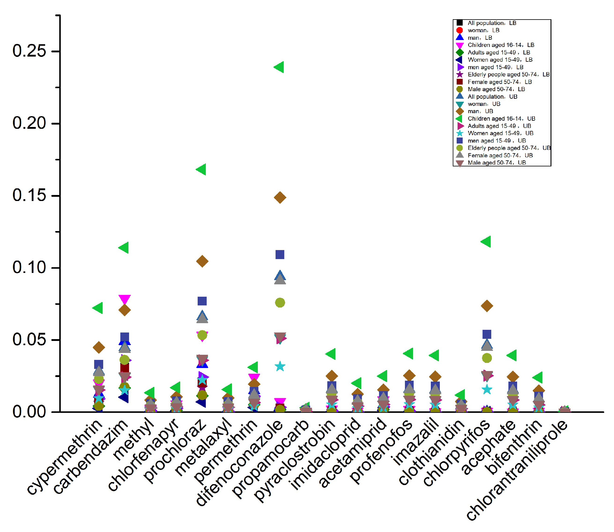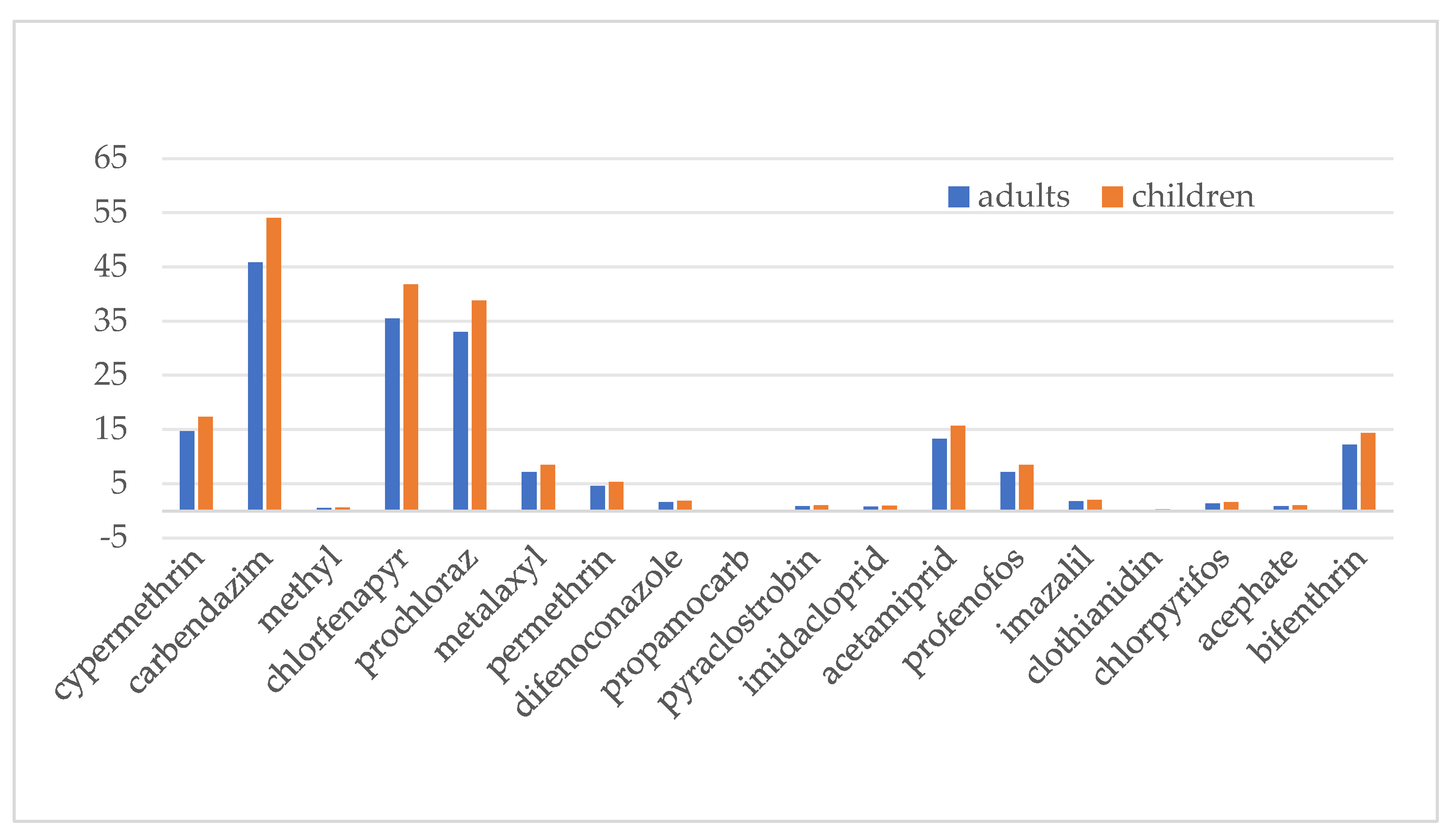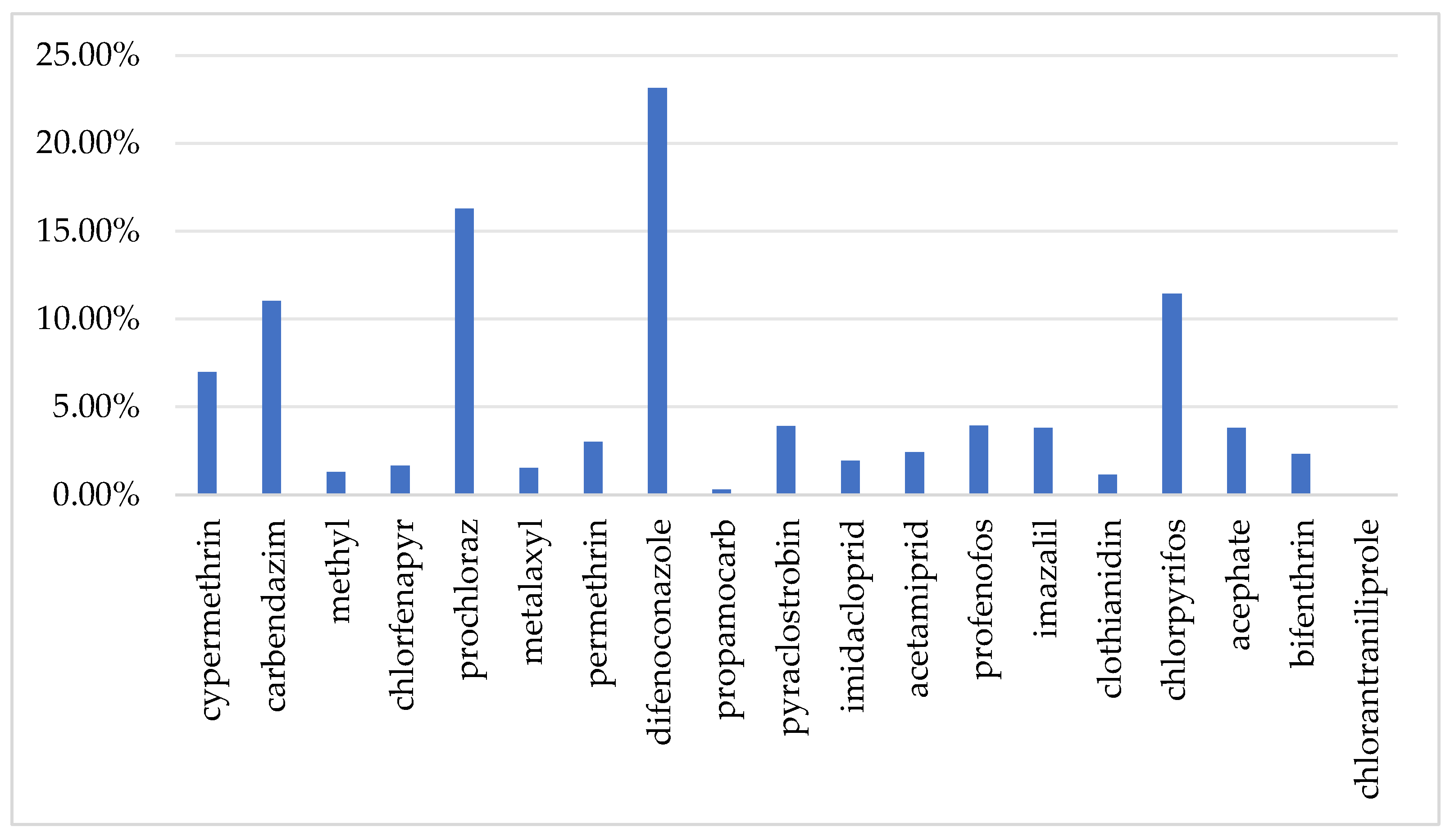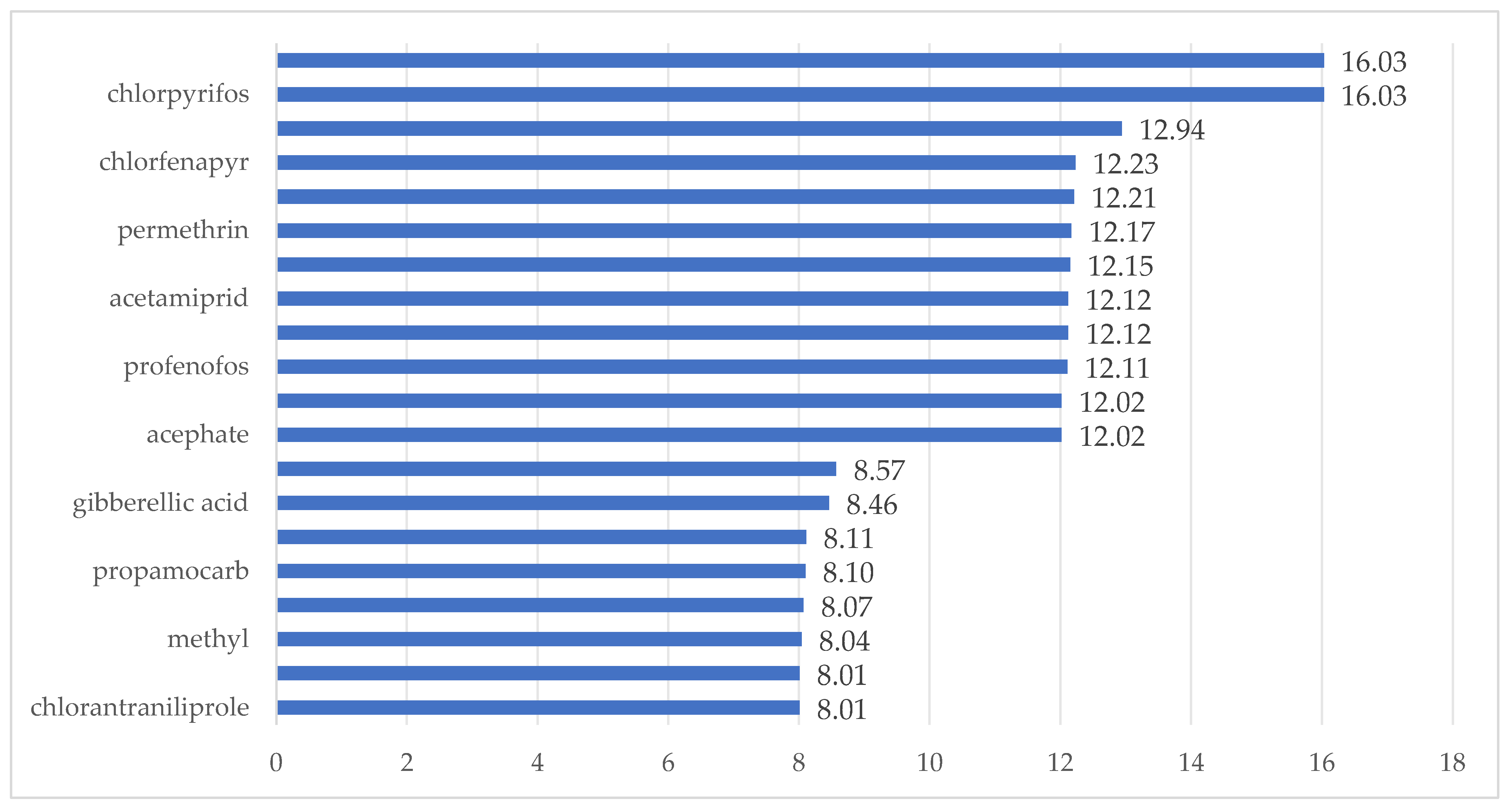 - Li, T.; Jiang, X.; Qiu, M. Measurement and evaluation of pesticide residue risk in vegetables: Evidence from China. Front. Public Health 2025, 13, 1563272. [Google Scholar] [CrossRef] [PubMed]