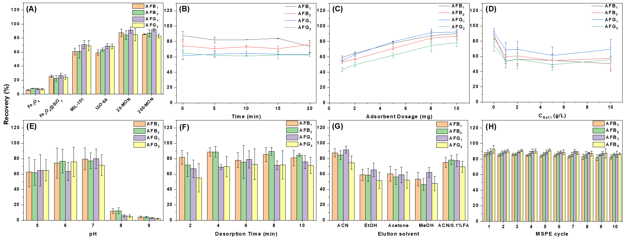| Fe3O4@PDA/MIL-101(Cr) | MSPE-UHPLC-MS/MS | Licorice | AFB1, AFG1, STE, ZEN, OTA | 0.5–50 | 78.53–116.28 | 0.01–0.09 | 1800 | 5 | [48] |