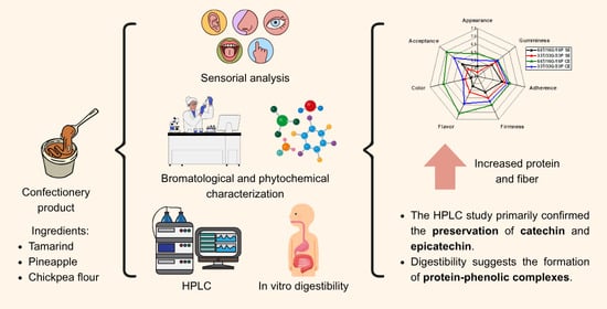 Therefore, the present study aims to (i) formulate functional soft candies incorporating tamarind, pineapple, and chickpea pulps; (ii) evaluate their proximate composition, phytochemical profile, and antioxidant capacity; and (iii) assess their in vitro protein digestibility to understand nutrient bio-accessibility. By addressing the gap in the literature regarding multi-ingredient, plant-based functional candies, this work contributes to the design of confectionery products with improved nutritional and bioactive properties, supporting innovation in healthier sweet formulations.