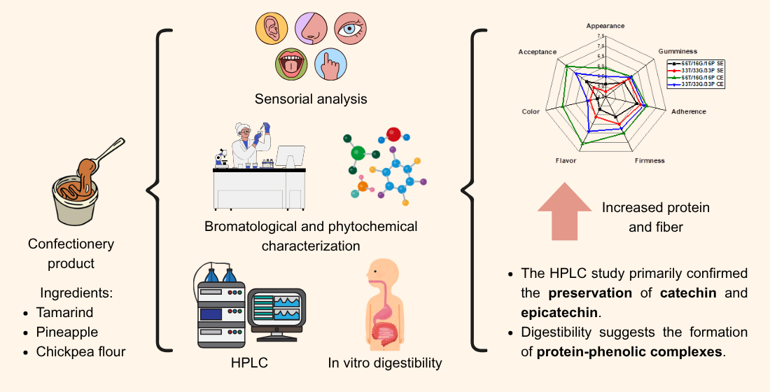The combination of these three ingredients was hypothesized to exert synergistic effects due to their complementary bioactive profiles. Tamarind and pineapple pulps are rich in polyphenols and enzymatic compounds such as bromelain, which contribute to antioxidant and anti-inflammatory activities. Chickpea flour, in contrast, provides plant-based proteins and soluble dietary fiber capable of forming non-covalent complexes with phenolics. These interactions may enhance the stability of phenolic compounds during processing and digestion, improving their bio-accessibility and antioxidant potential. Therefore, the integration of tamarind, pineapple, and chickpea offers a balanced formulation that unites phenolic-rich fruits with a protein- and fiber-based matrix, supporting the design of multifunctional confectionery products with controlled release of bioactives and improved nutritional quality.