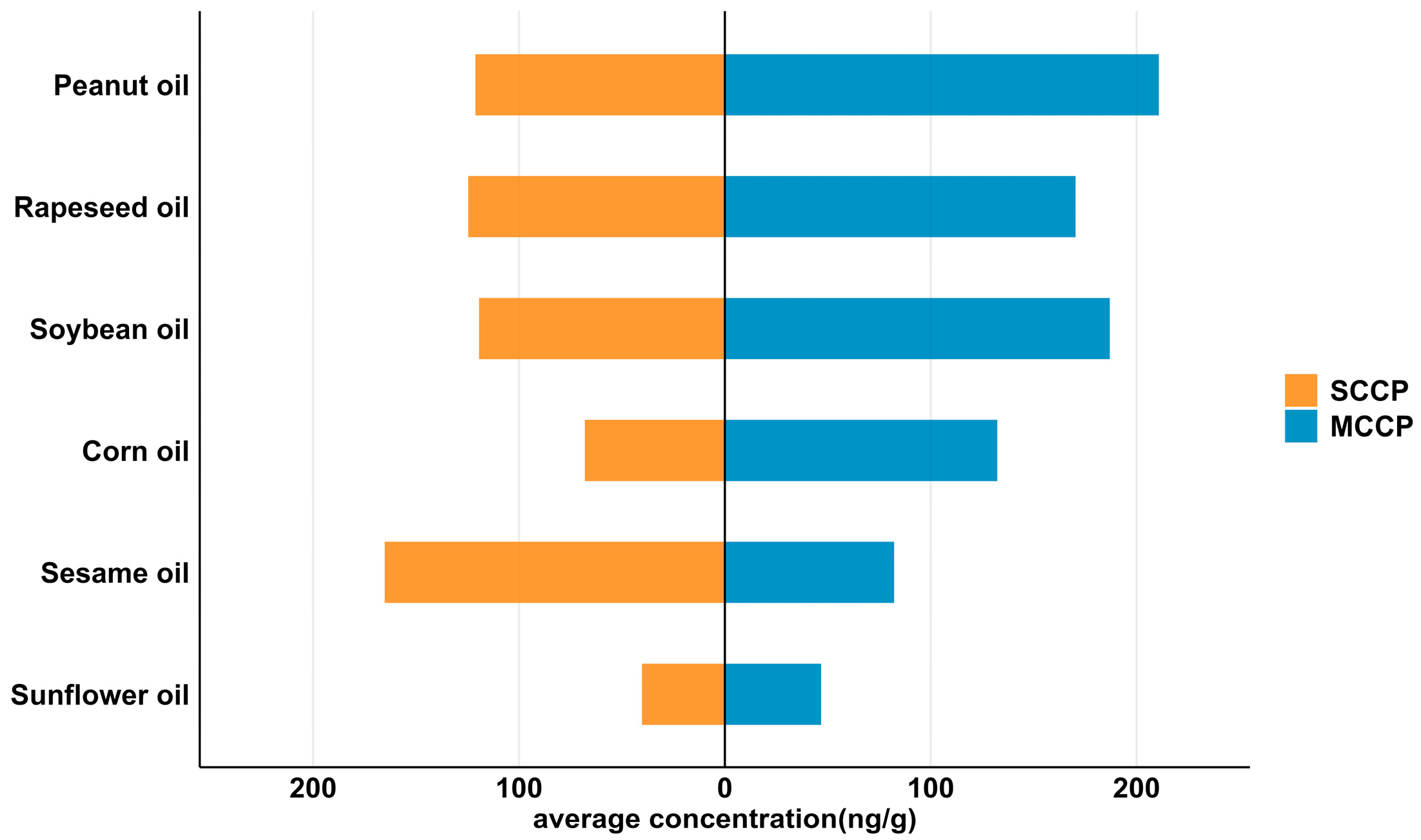 3.1. Concentrations of SCCPs and MCCPs in Edible Vegetable Oils
