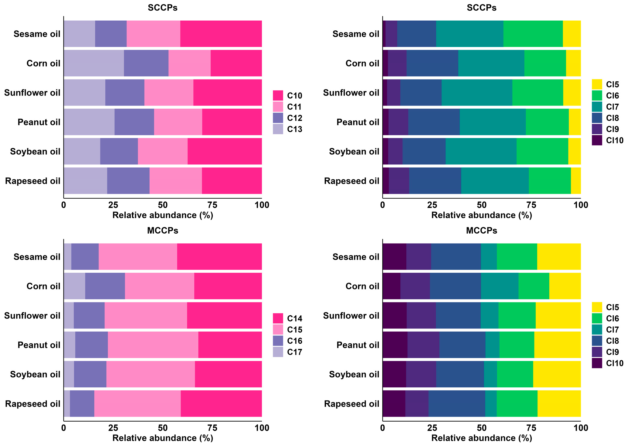 3.2. Congener Group Profiles of SCCPs and MCCPs in Different Vegetable Oils