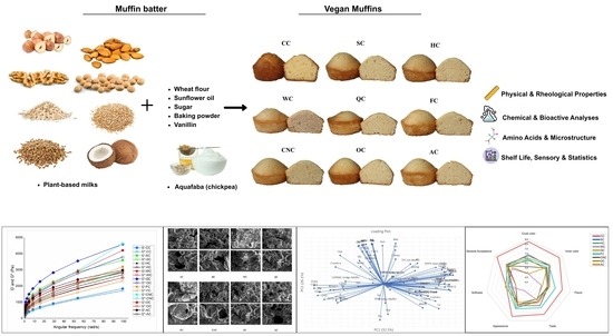 63]. These findings support the present observation that coconut, oat, and quinoa milks reinforced aquafaba-based batters more effectively than cow’s milk, highlighting the importance of milk composition in determining rheological behavior and final muffin quality.