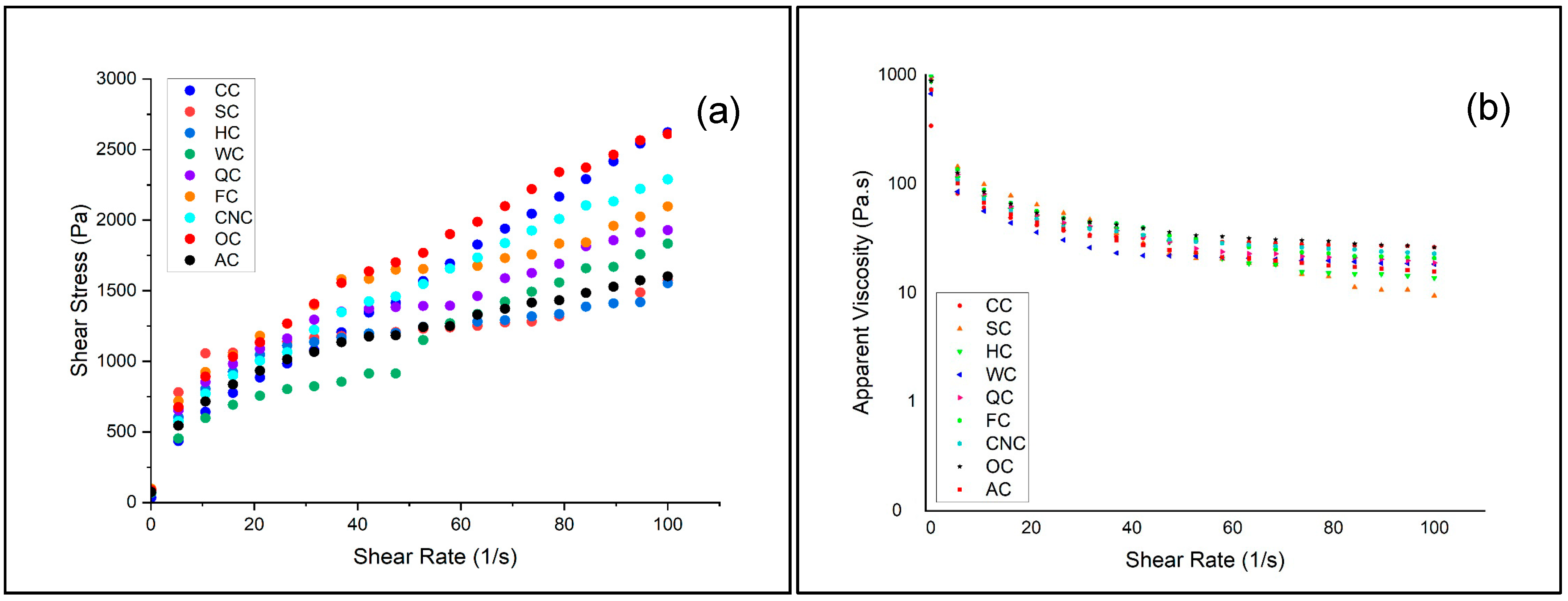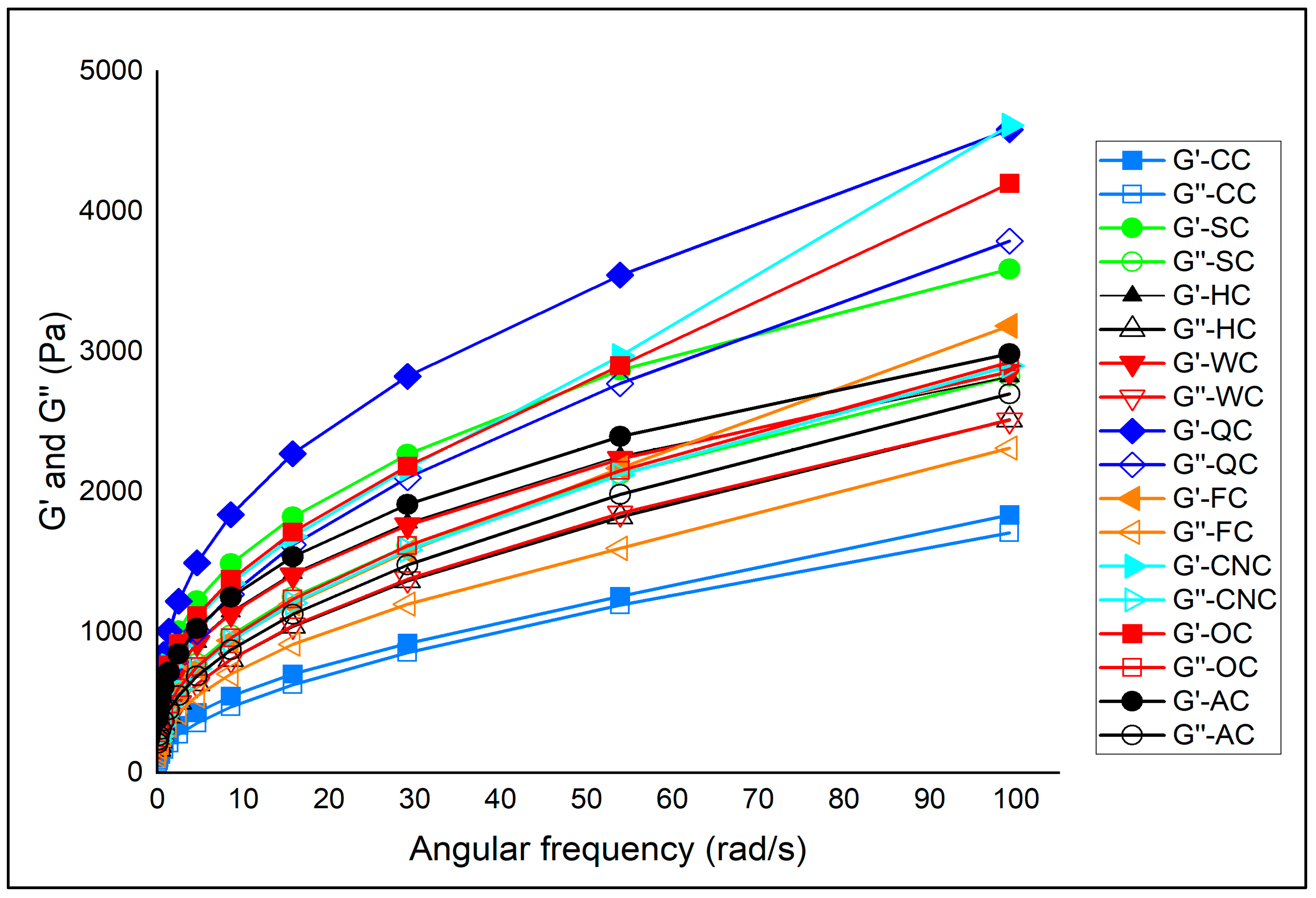 δ values (closer to elastic dominance) were observed in SC (0.609), OC (0.631), and CNC (0.636), indicating stronger elastic contributions and better stability. Conversely, higher tan