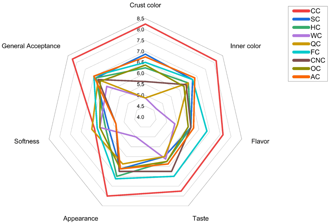 b* values were highest and increased in CC (30.99 to 33.28), but remained lower in WC (24.57 to 23.60). For crumb color,