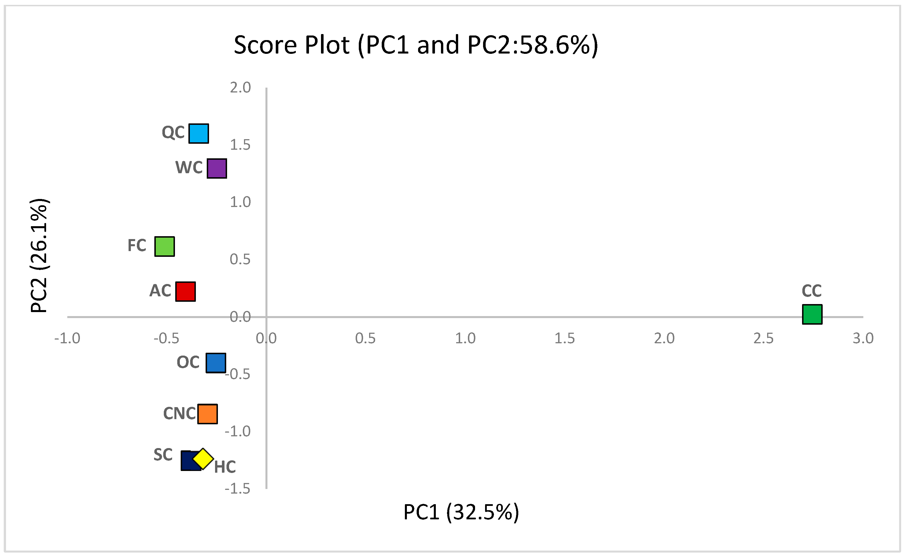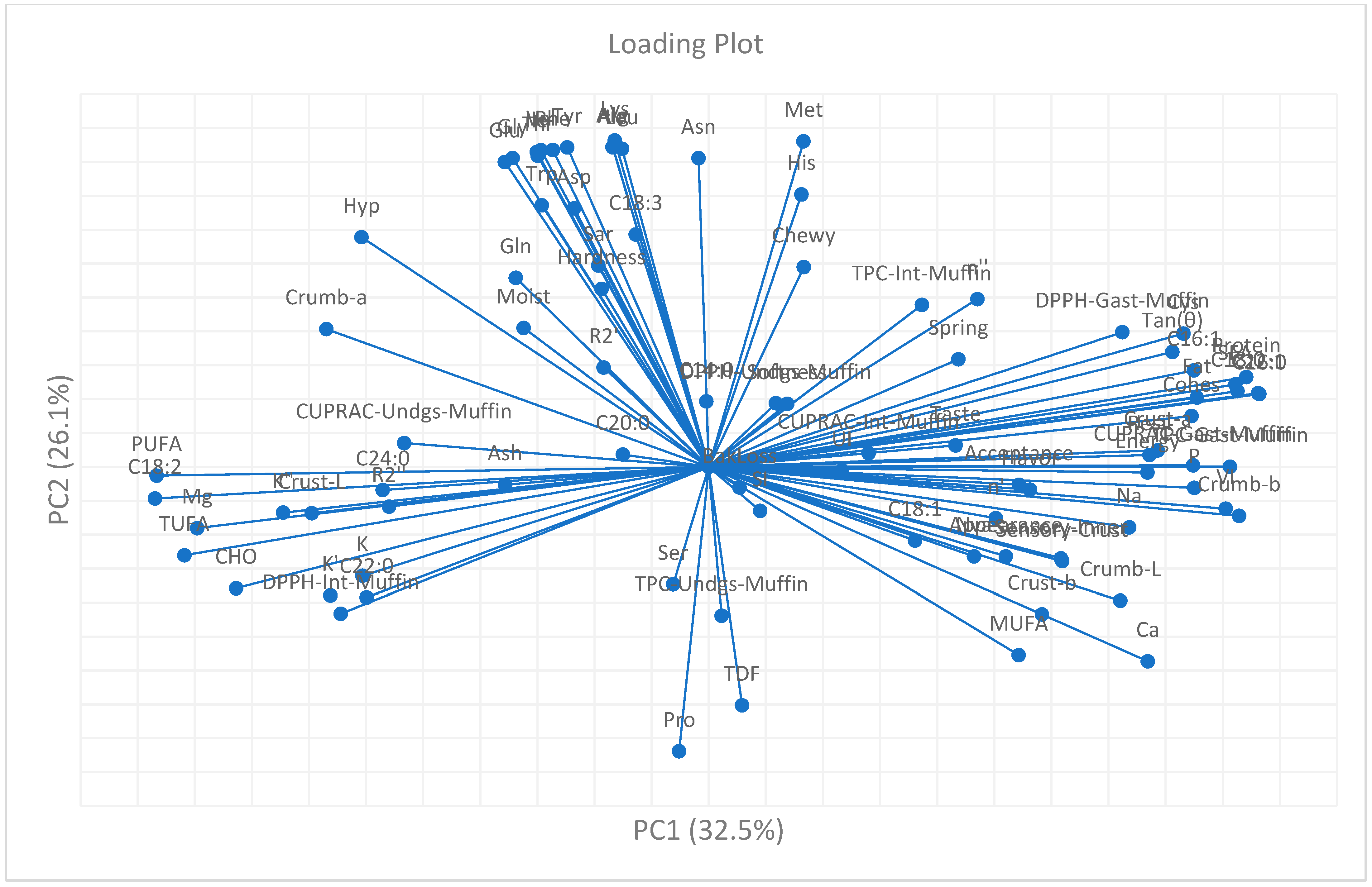 The PCA score plot revealed clear sample differentiation. The control muffin (CC) was distinctly separated along PC1 due to its higher protein, fat, and SFA loadings, reflecting its strong structural and compositional integrity. Plant-based milk formulations formed subgroups on the negative side of PC1: quinoa (QC) and walnut (WC) muffins positioned higher along PC2, indicating enhanced amino acid and antioxidant characteristics [