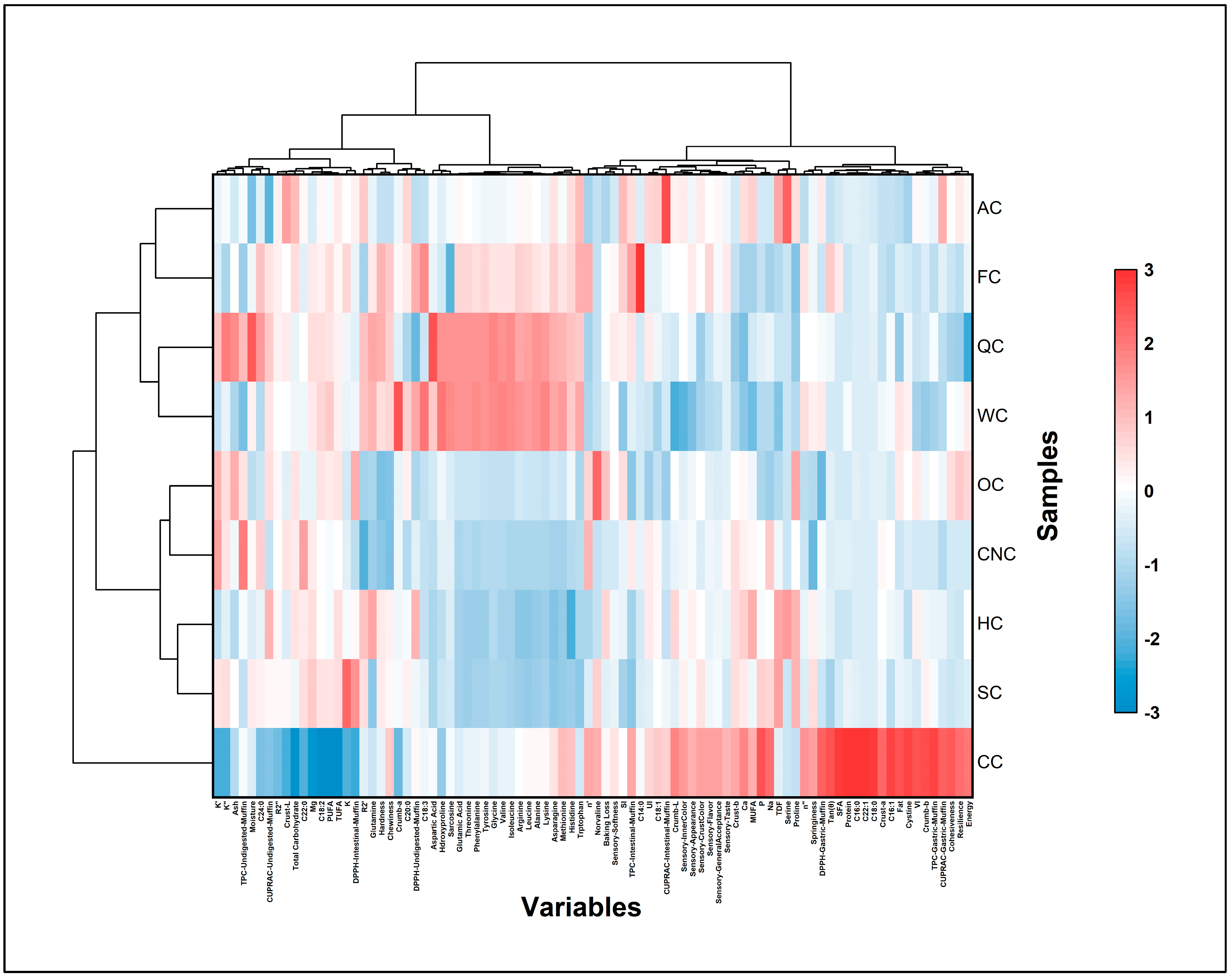 Cluster II included FC, CNC, OC, and AC muffins, which shared higher levels of protein and dietary fiber, as well as stronger textural resilience and enhanced antioxidant bioaccessibility. The proximity of FC and CNC samples reflected the contribution of mucilage- and hydrocolloid-rich compounds that supported a cohesive and elastic crumb network [