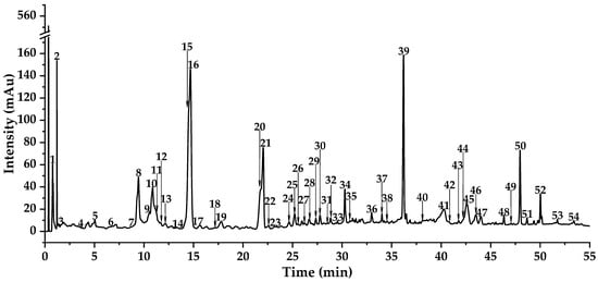 A total of fifty-two chromatographic peaks were tentatively characterized by comparing their Rt, BPC, TIC, precursor ions, and fragment ions with data from well-documented literature and databases (Table S1, Figure 1, Figure 2 and Figure 3). Specifically, these compounds were primarily categorized into two major classes: organic acid derivatives and flavonoids. Moreover, flavonoids mainly include flavones, flavonols, dihydroflavones, isoflavones, flavonoid lignans, etc.