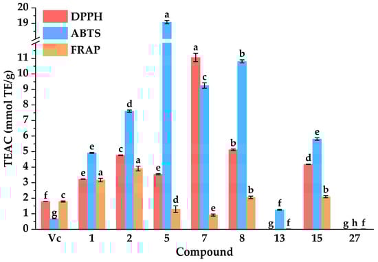 Antioxidant activities of potential inhibitors from DE. IC50: 50% inhibitory concentration. TEAC: Trolox equivalent antioxidant capacity. Different letters (a–h) indicate that the means have significant differences at the p < 0.05 level (n = 3) by DMRT (Duncan’s multiple range test).