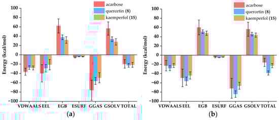 Key residue energy contribution diagram of ligand-enzyme complexes. (a) Complexes of α-amylase; (b) Complexes of α-glucosidase.