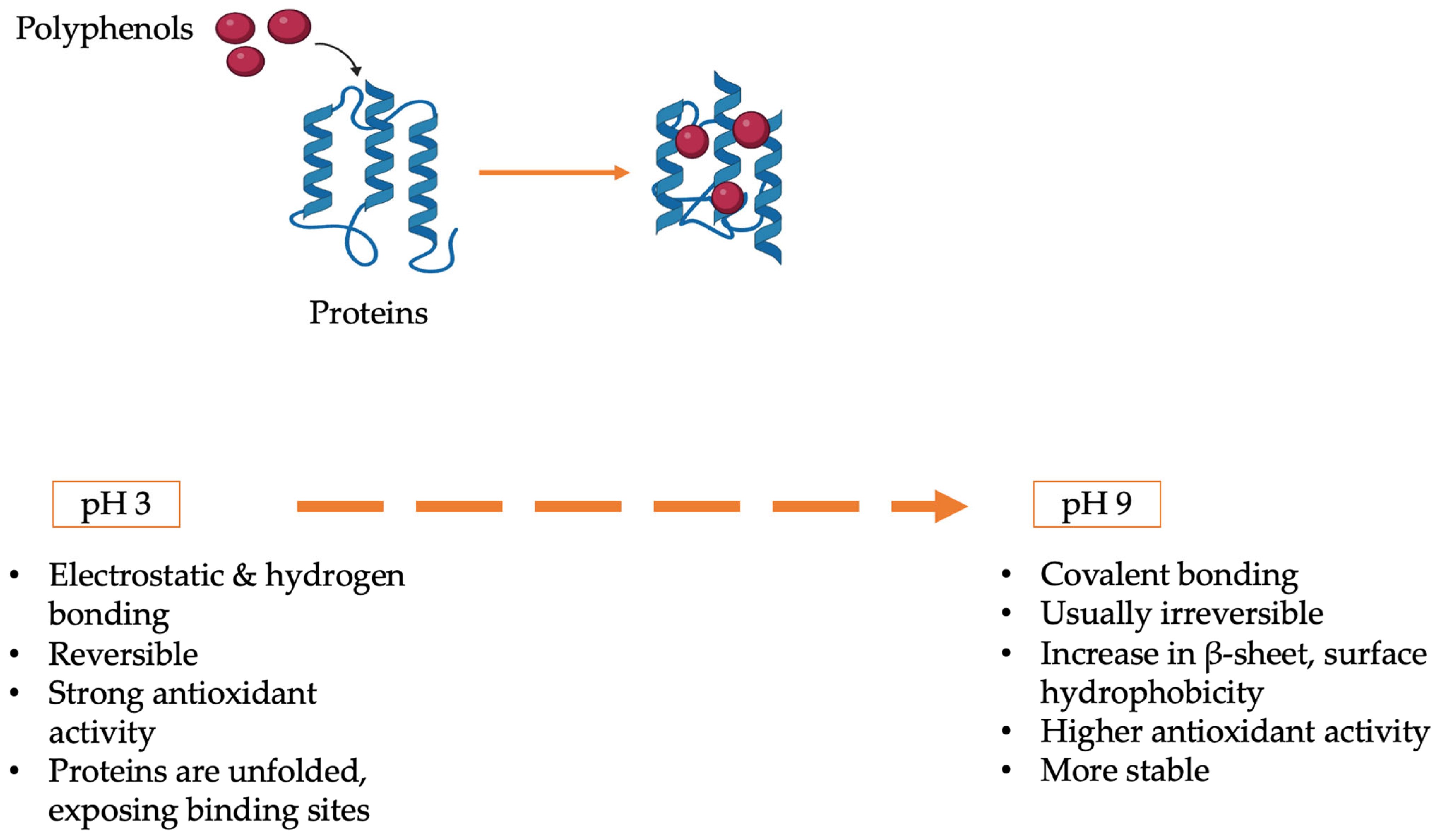 67]. It was observed that protein–polyphenol interactions at alkaline pH enhance electron transfer reactions, thereby improving antioxidant efficiency [