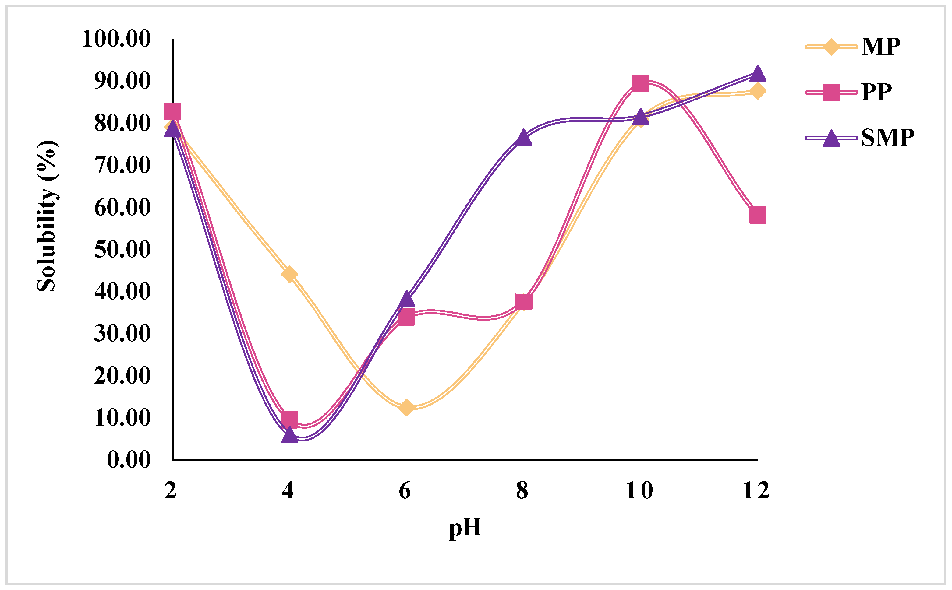 Overall, while all proteins maintained stable ZP values, MP showed the most aggregation at neutral pH, PP exhibited the best electrostatic stability, and SMP maintained a relatively balanced profile. The lower DH values at acidic pH indicate better dispersion, while higher values at neutral and alkaline pH suggest increased aggregation [