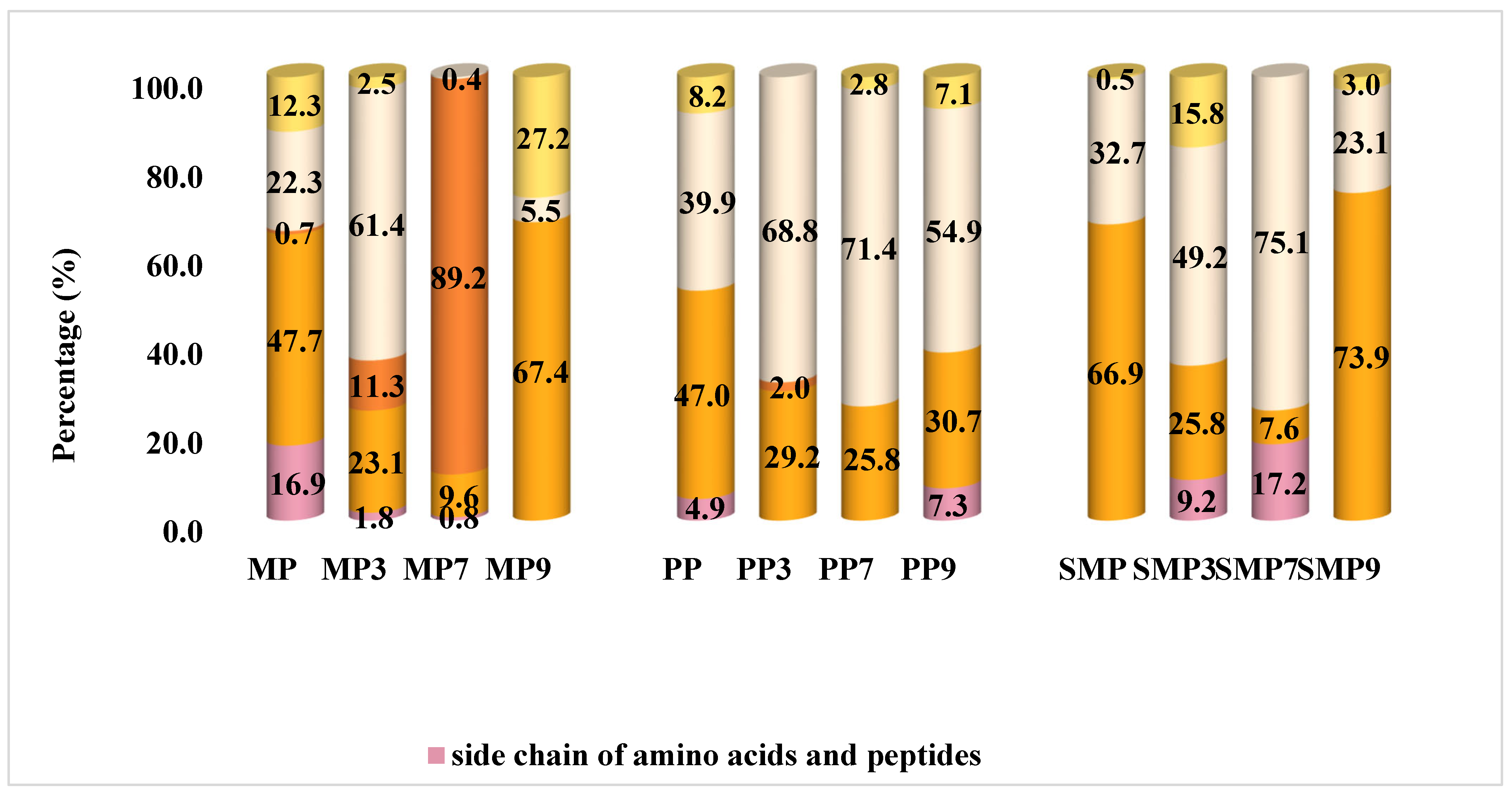 76]. SMP7 exhibited the highest β-sheet content and the lowest random coil proportion, suggesting that pH 7 enhances protein structural rigidity [