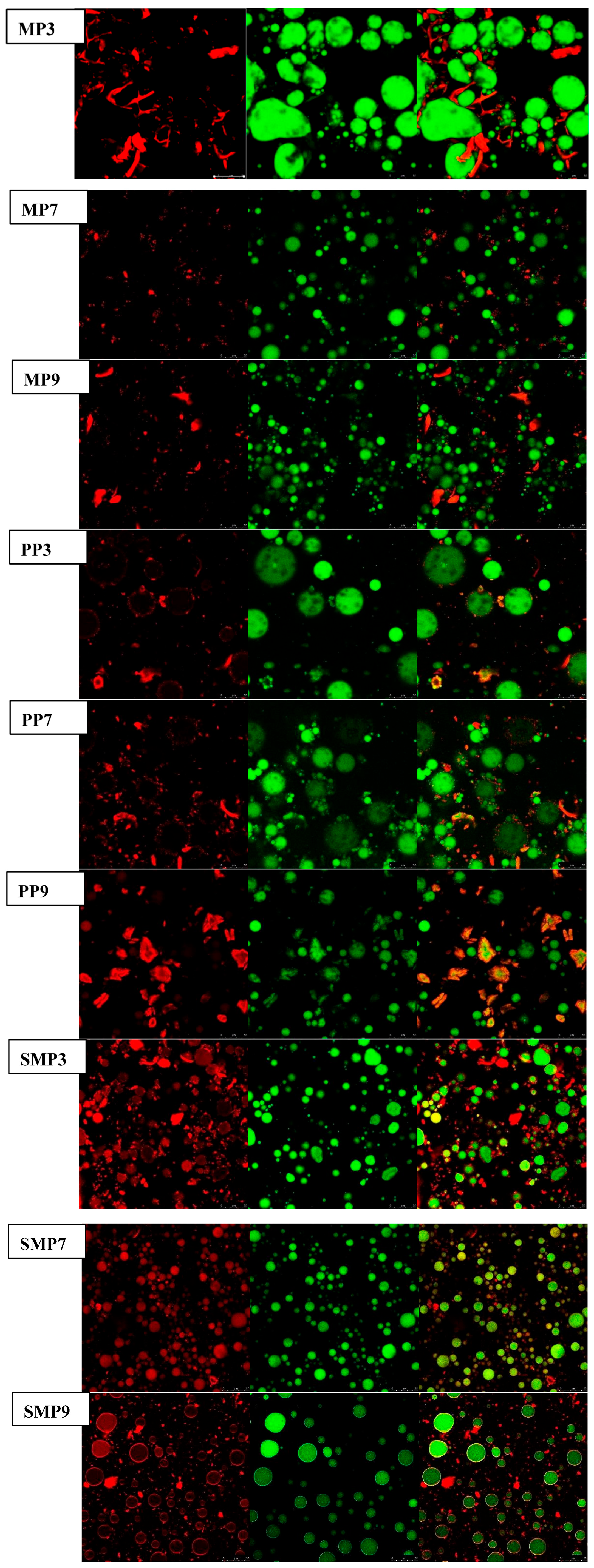 79]. At pH 7, SMP7 had a stable structure with low protein aggregation, but SMP9 showed minor protein separation from the oil phase, indicating mild instability but better structural retention than MP9 and PP9.