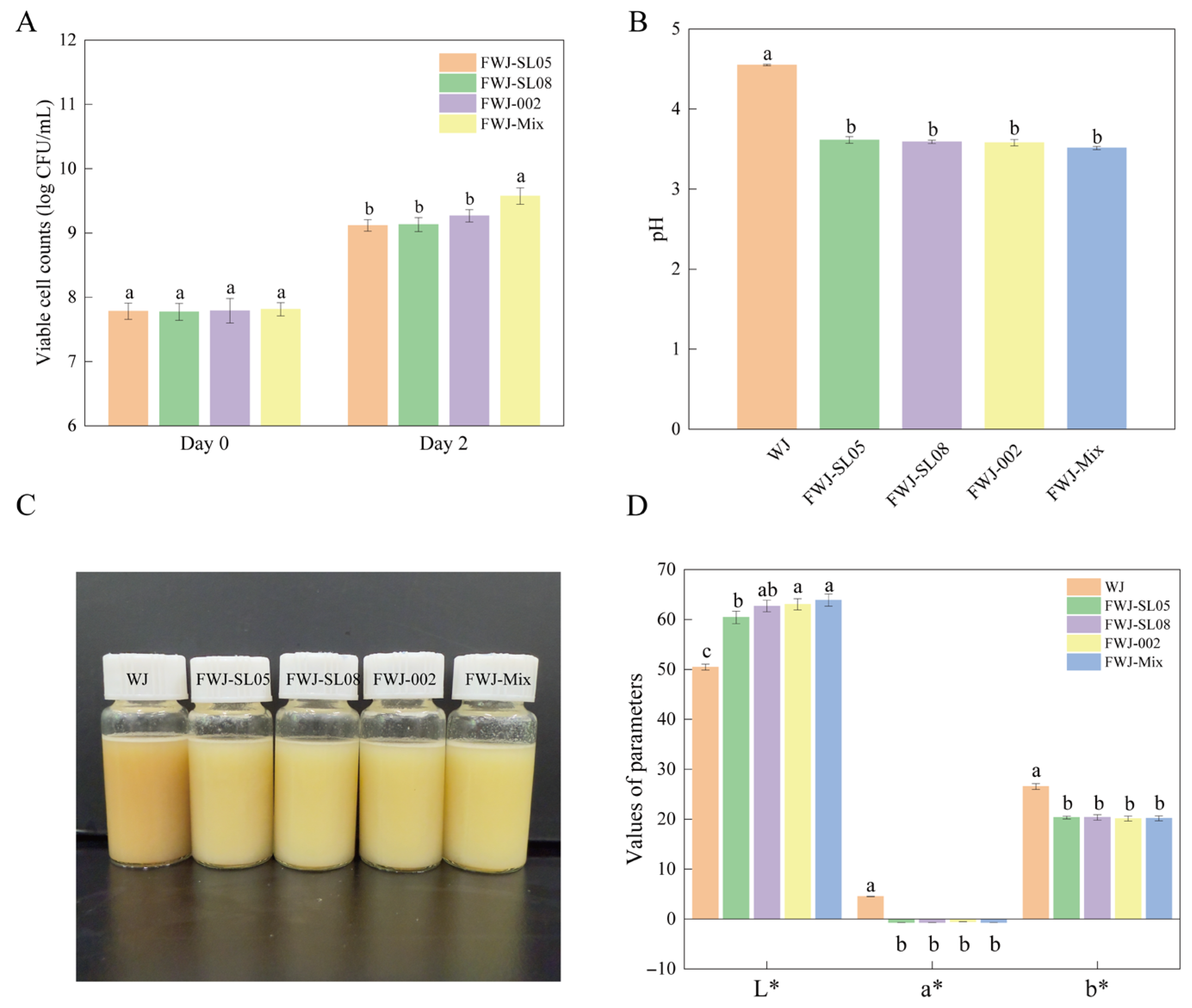3.2. Physicochemical Characterization of FWJ Prepared via Single and Mixed LAB Fermentations
