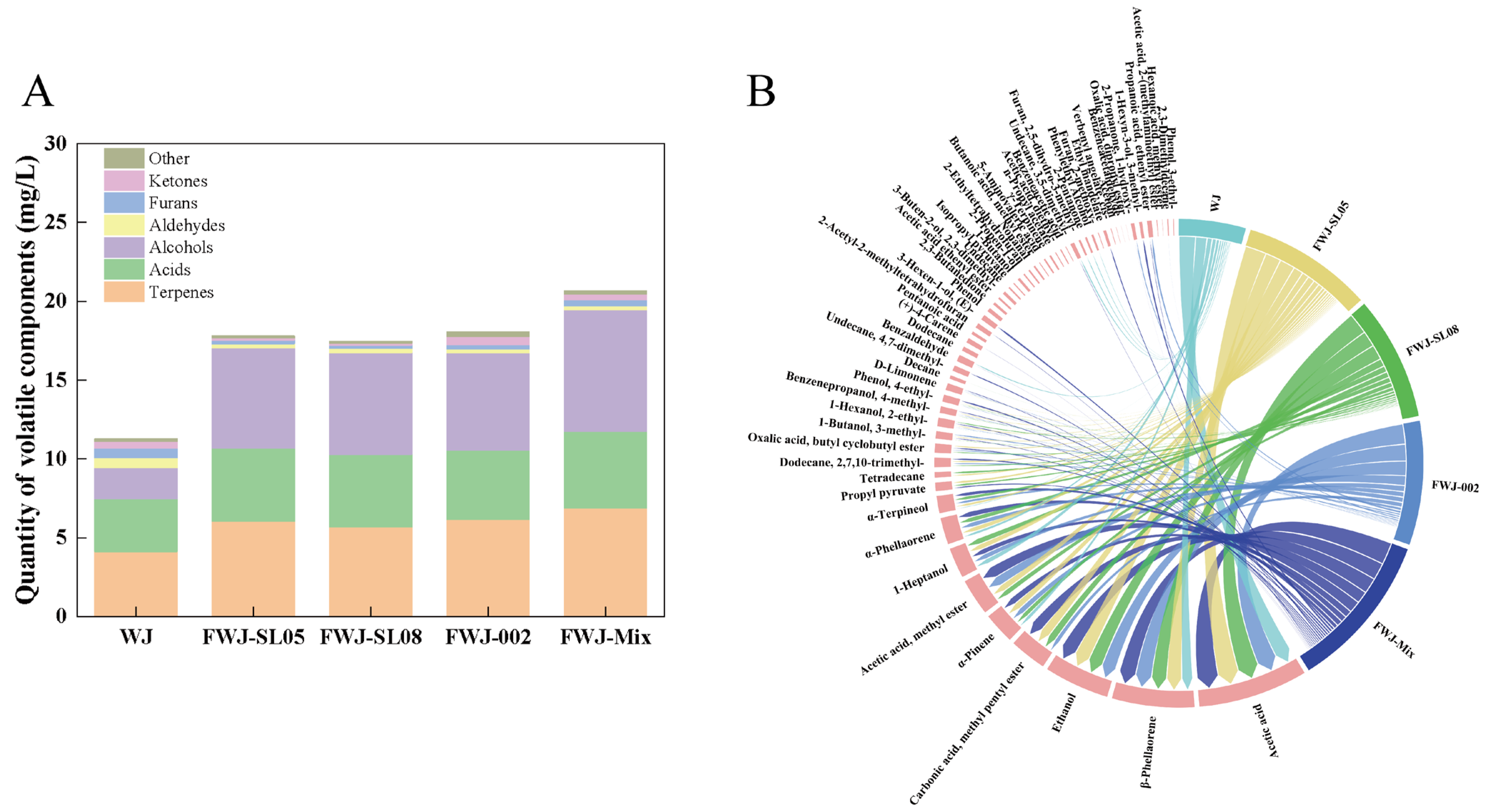 3.7. Analysis of Volatile Components in FWJ Prepared via Single and Mixed LAB Fermentations