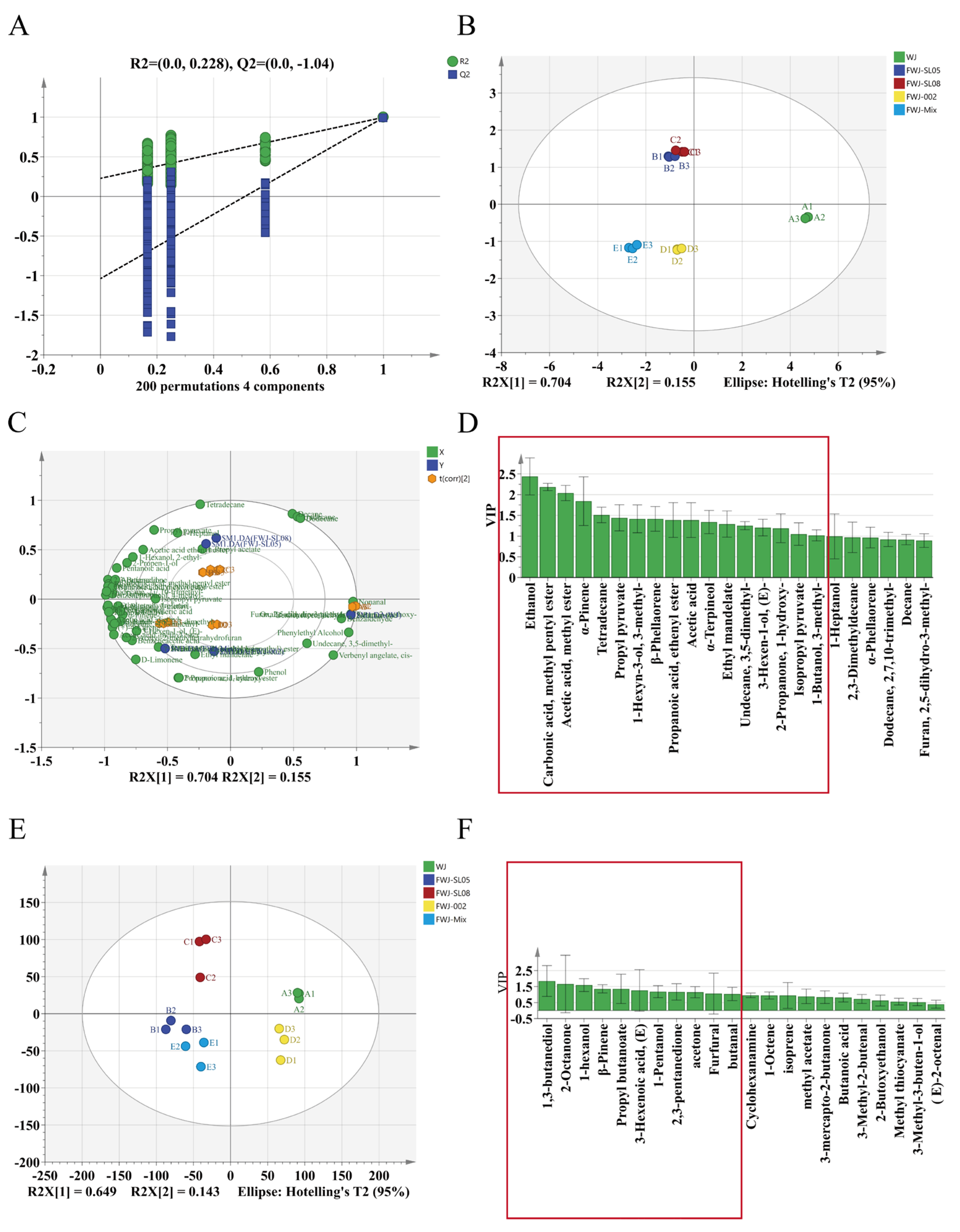 3.8. OPLS-DA Analysis of VOCs in FWJ Prepared via Single and Mixed LAB Fermentations