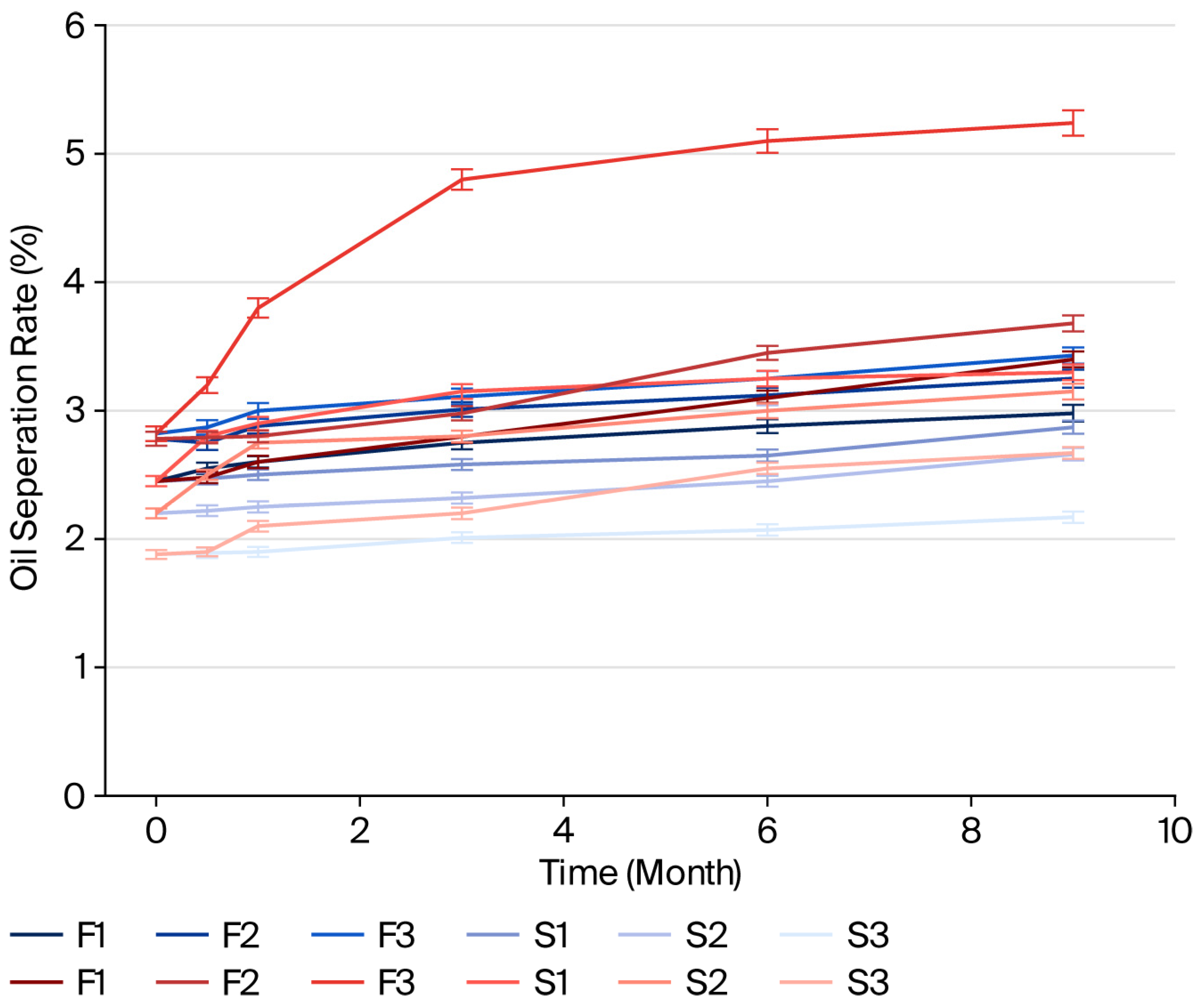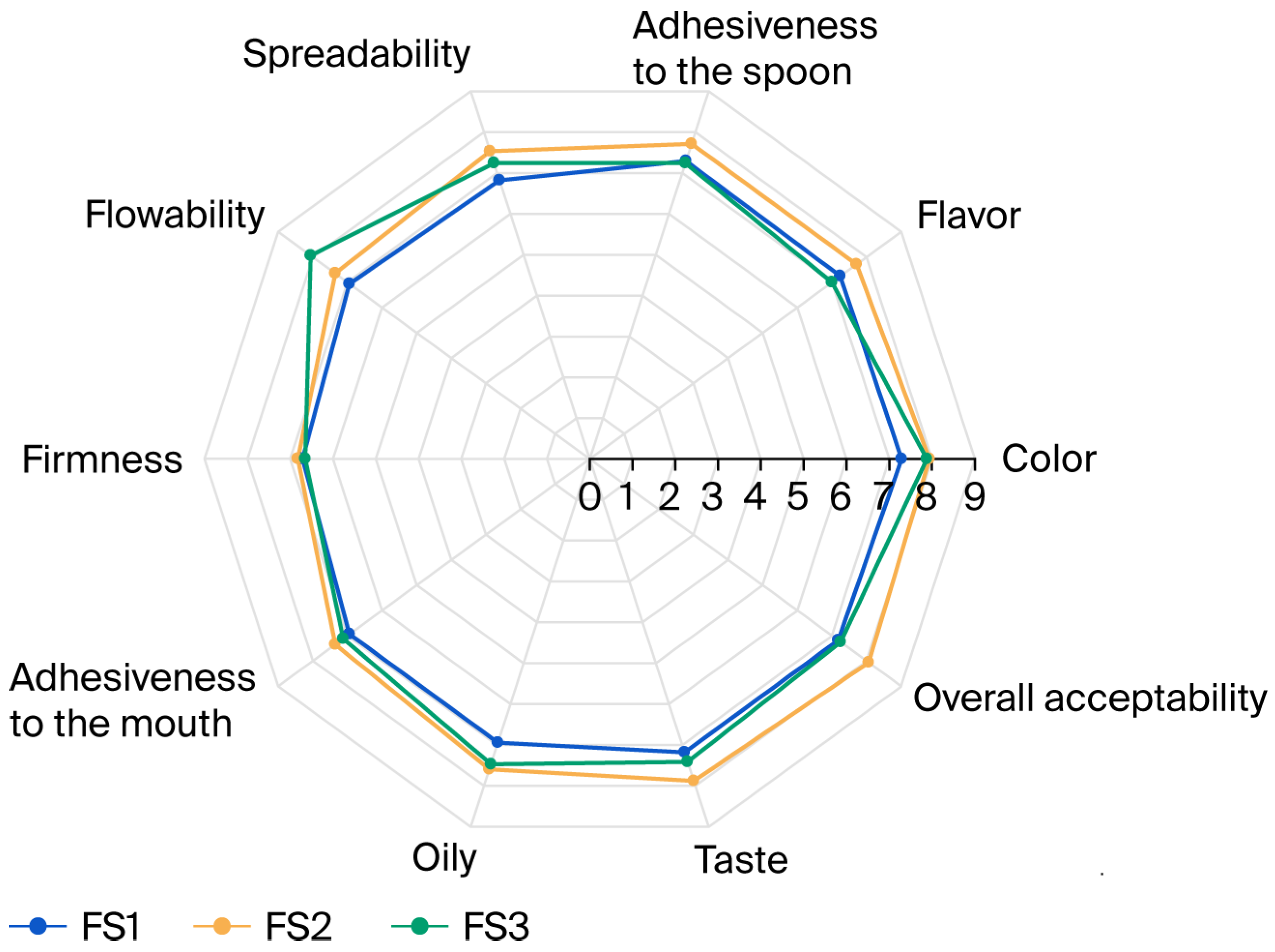 | Samples | Firmness (N) | Spreadability (N·s) | Adhesiveness (N·s) |