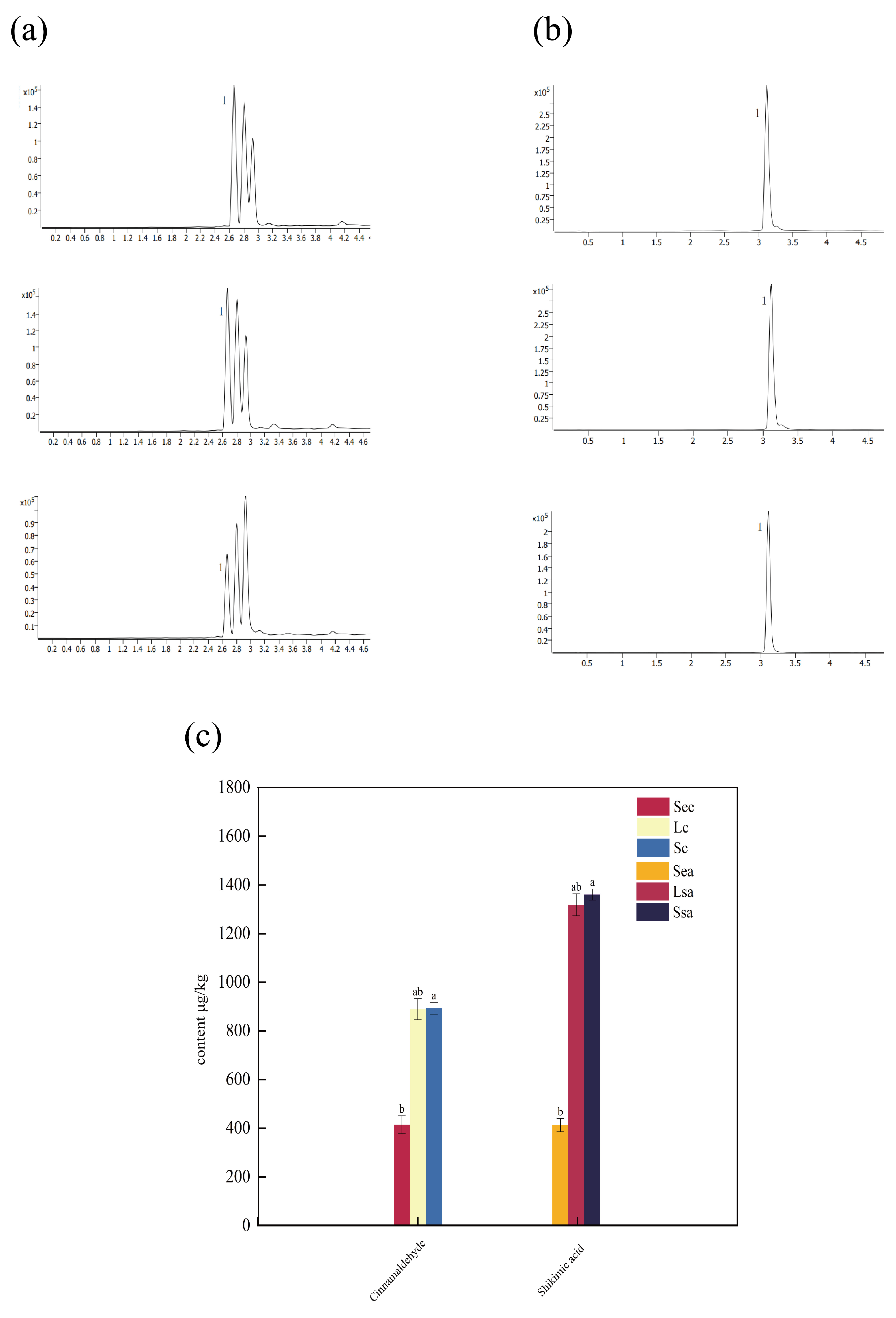 | 4-Methoxycinnamaldehyde | Woody, citrus aroma | 0.11 | 29.0618 ± 0.0017 a | 25.1679 ± 0.0014 ab | 13.2037 ± 0.0011 b |