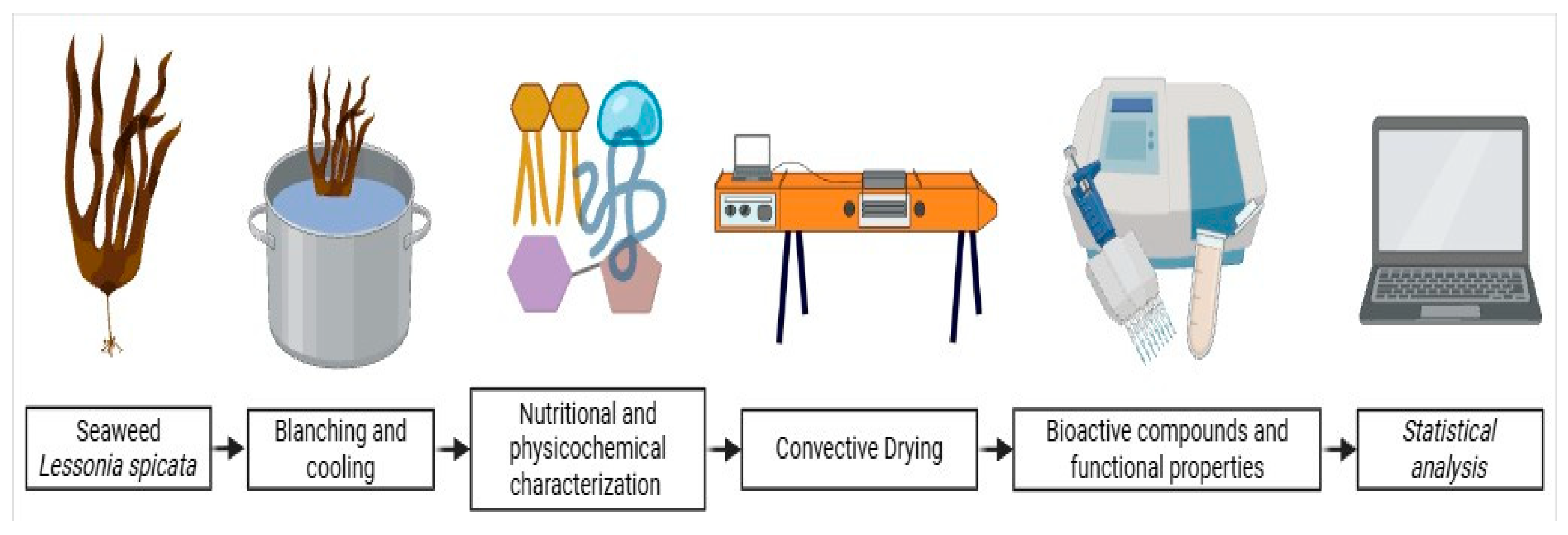 Pizarro-Oteíza, S.; Cea, R.; Aranda, M.; López, J.; Macaya, E.; Salazar, F.; Cavieres, O.; Sandoval-Bórquez, A.; Lemus-Mondaca, R.; Abarca, R.L.; et al. Convective Drying of Brown Seaweed (Lessonia spicata): Modeling, Energy Efficiency, and Impact on Bioactive Compounds and Functional Properties. Foods 2025, 14, 4011. https://doi.org/10.3390/foods14234011