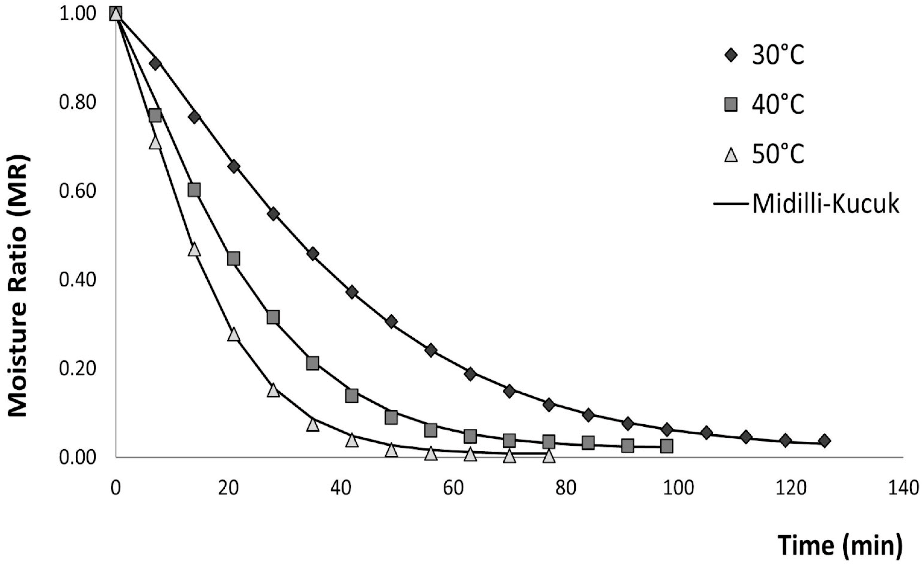 | Midilli–Kucuk | a = 0.993, k = 0.009, n = 1.264, b = 0.0001 | 0.999 | 0.001 | 0.0005 | 0.00004 | −130.119 | |
