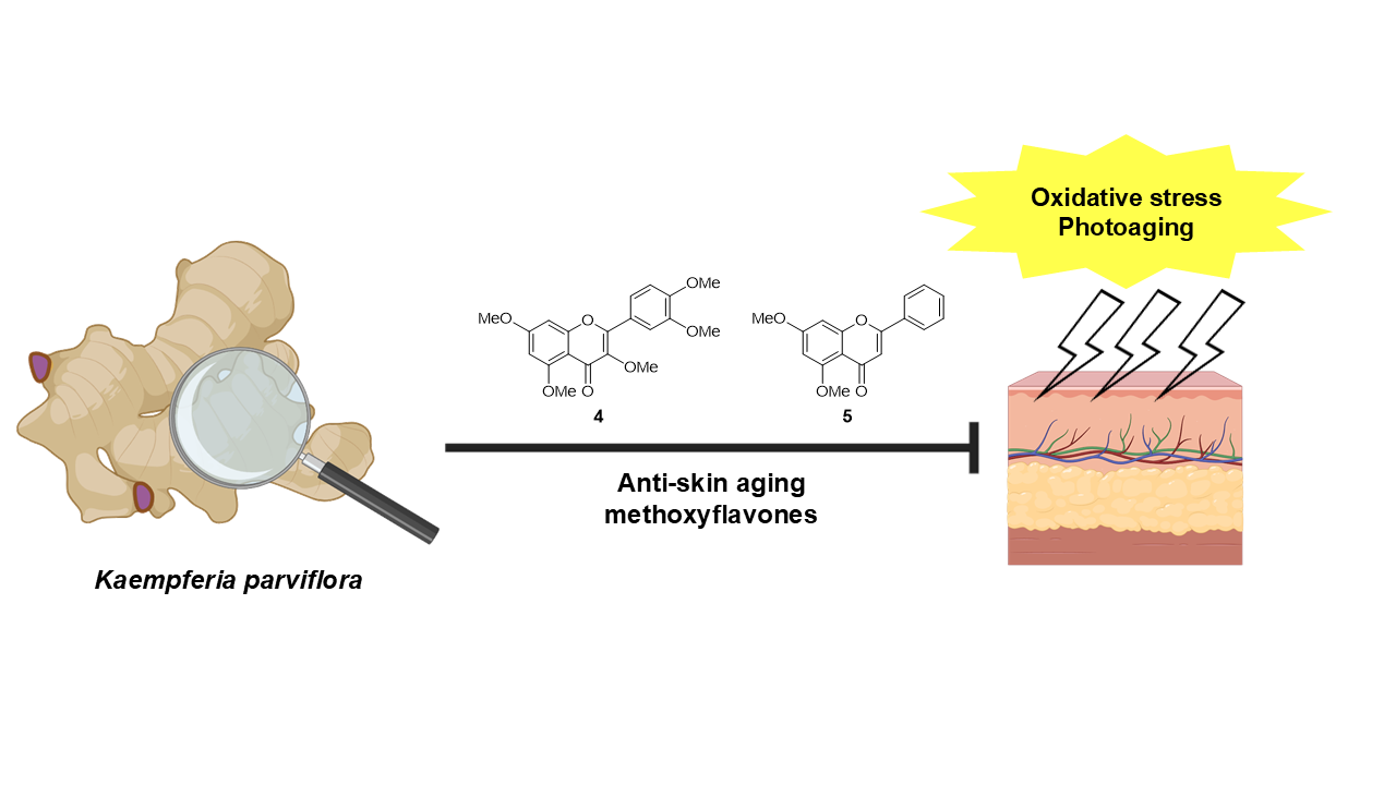 - Klinngam, W.; Rungkamoltip, P.; Thongin, S.; Joothamongkhon, J.; Khumkhrong, P.; Khongkow, M.; Namdee, K.; Tepaamorndech, S.; Chaikul, P.; Kanlayavattanakul, M. Polymethoxyflavones from Kaempferia parviflora ameliorate skin aging in primary human dermal fibroblasts and ex vivo human skin. Biomed. Pharmacother. 2022, 145, 112461. [Google Scholar] [CrossRef] [PubMed]