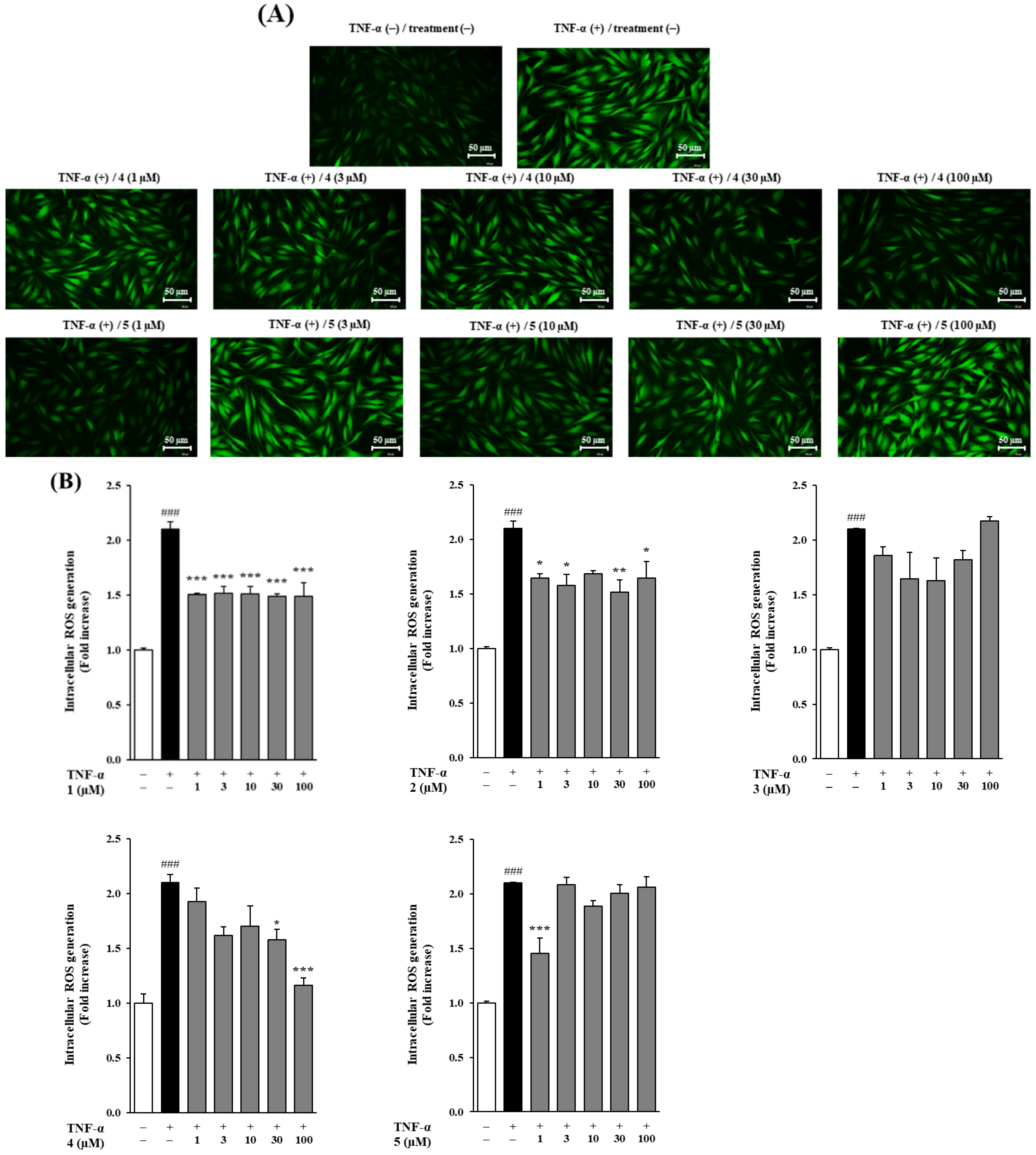 3.3. Effects of Methoxyflavones 1–5 on Intracellular ROS Generation in TNF-α-Stimulated NHDFs